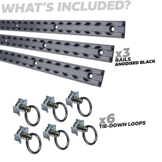 3x Cargo Track/Rails + 6x Tie-down loops - Wide Type - Black