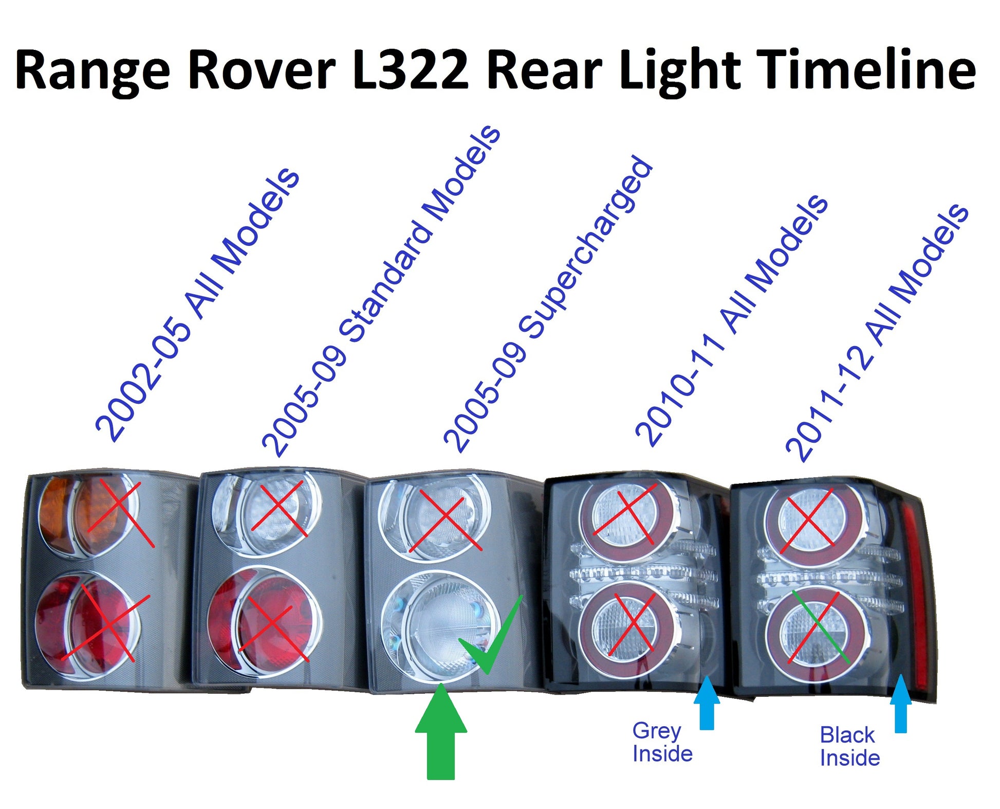 These bulb will fit all Range Rover L322 SUPERCHARGED models LHD / RHD from 2005 to 2009 with the upper and lower clear clusters in the rear light ( you may have an earlier model that has had the rear lights upgraded )