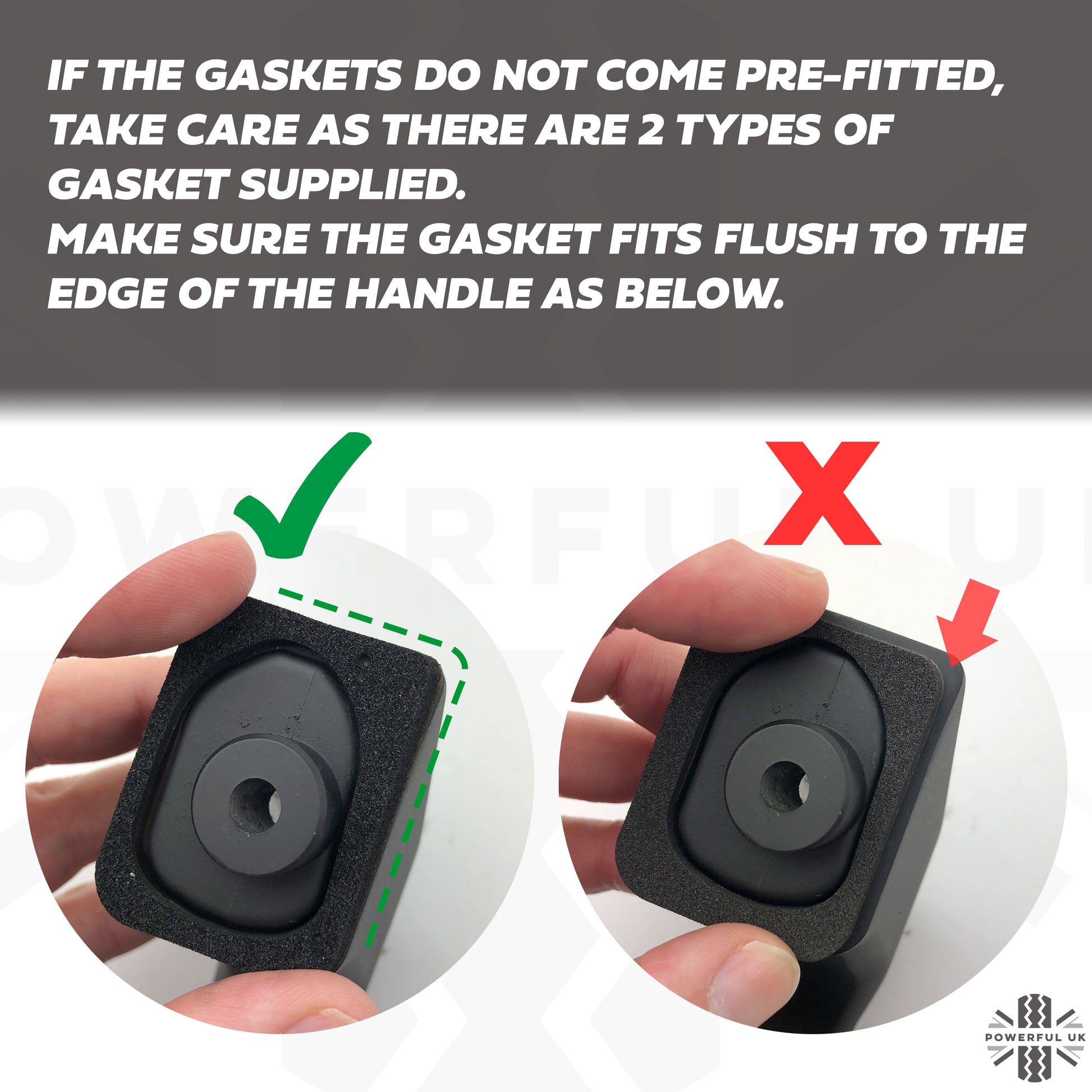 Note: If the gaskets are not pre-fitted, you just need to fit them yourself. There are 2 types of gasket included (you'll receive 2 of each) - so test fit each gasket before sticking in to place. The gasket should fit flush to the edges of the handle.