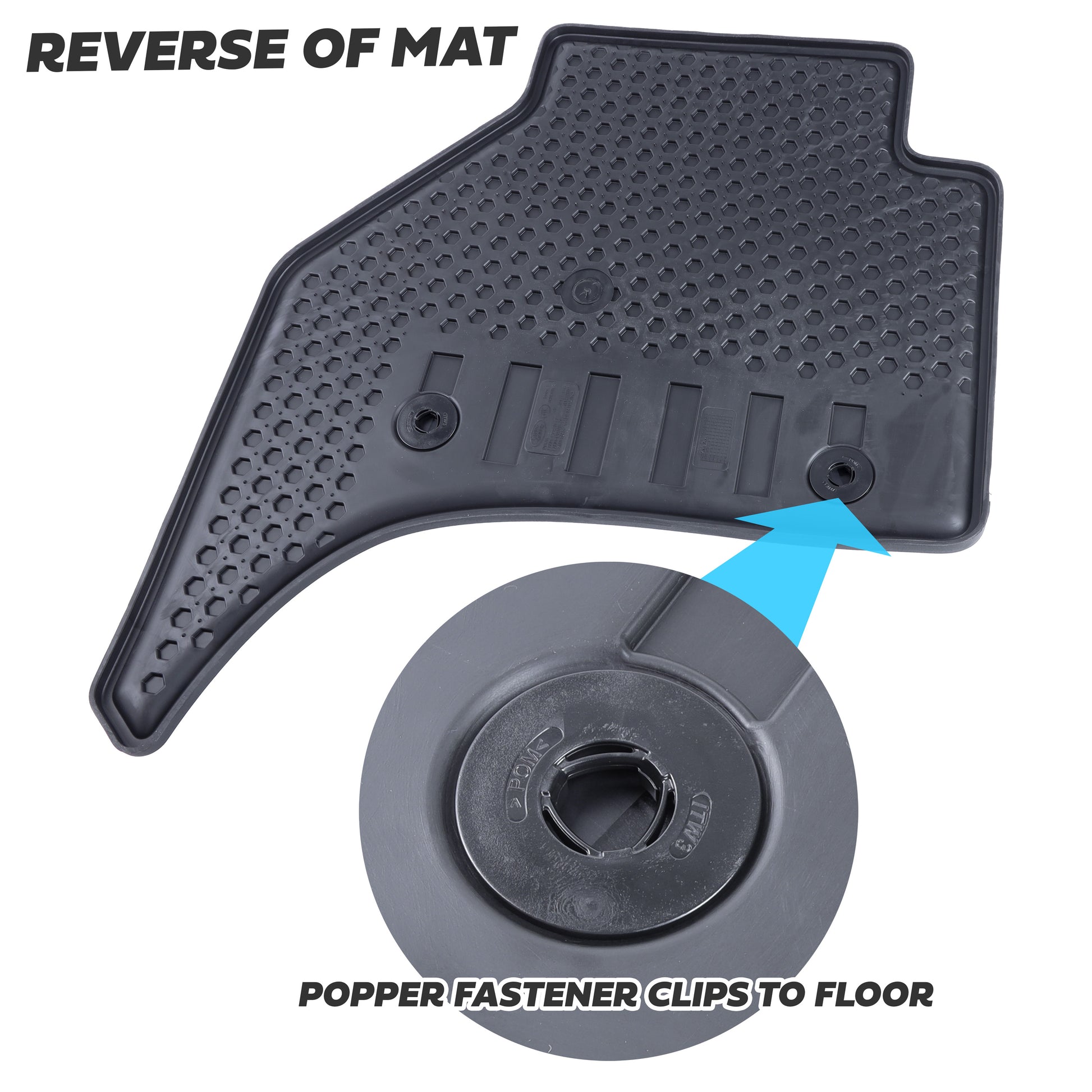 The front mats include integrated popper fasteners which secure onto the floor to stop any movement.