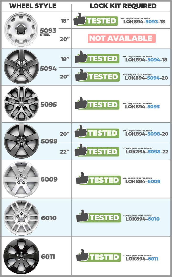 These lock kits are wheel style specific so please check this is the correct kit for your wheel style (see photo) - this kit is for the 18" Style 5094 wheel (see other listing for 20" version).