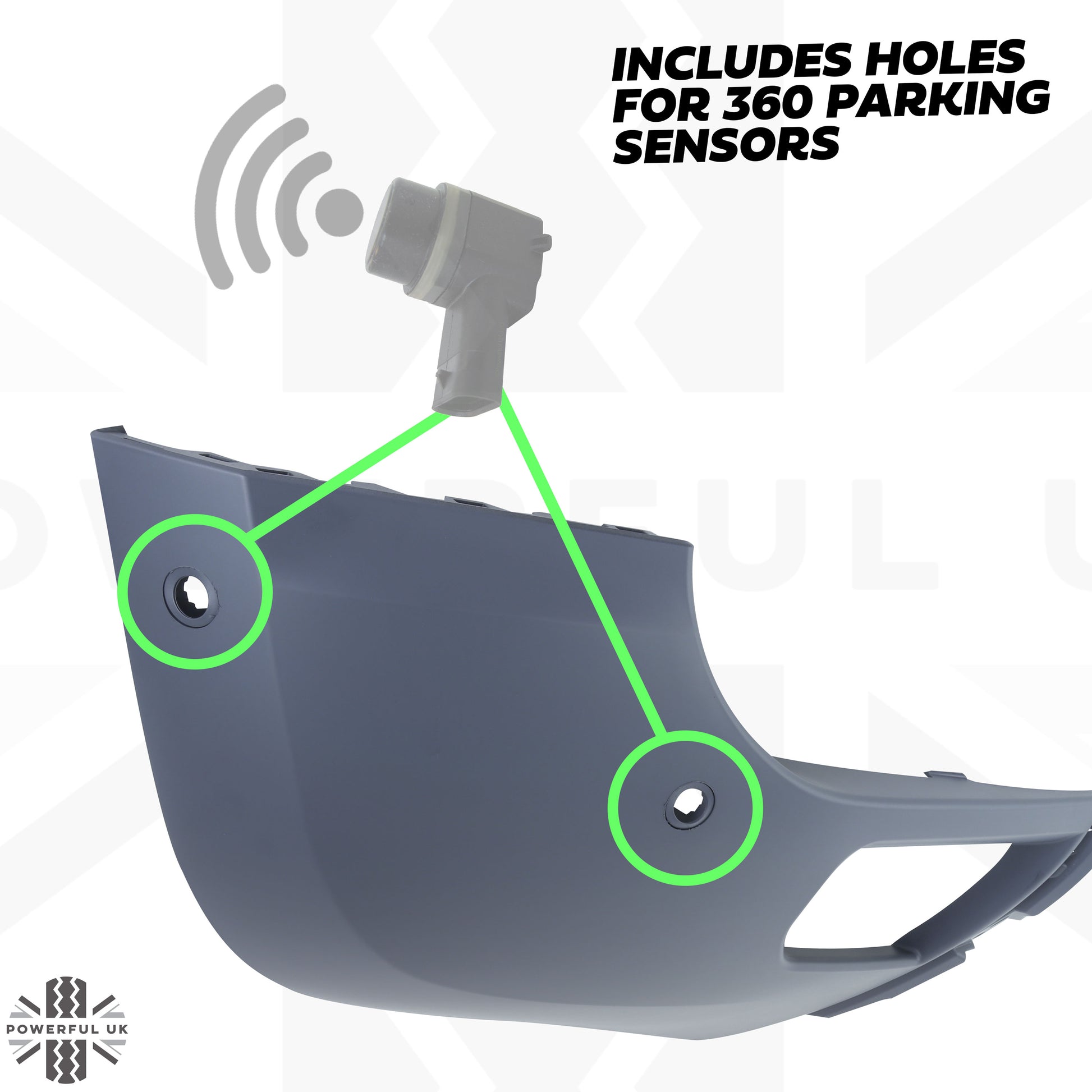 This bumper corner includes the 2 holes (and brackets) for the '360 parking aid' sensors (most models seem to have these) - so please check you require these before ordering.