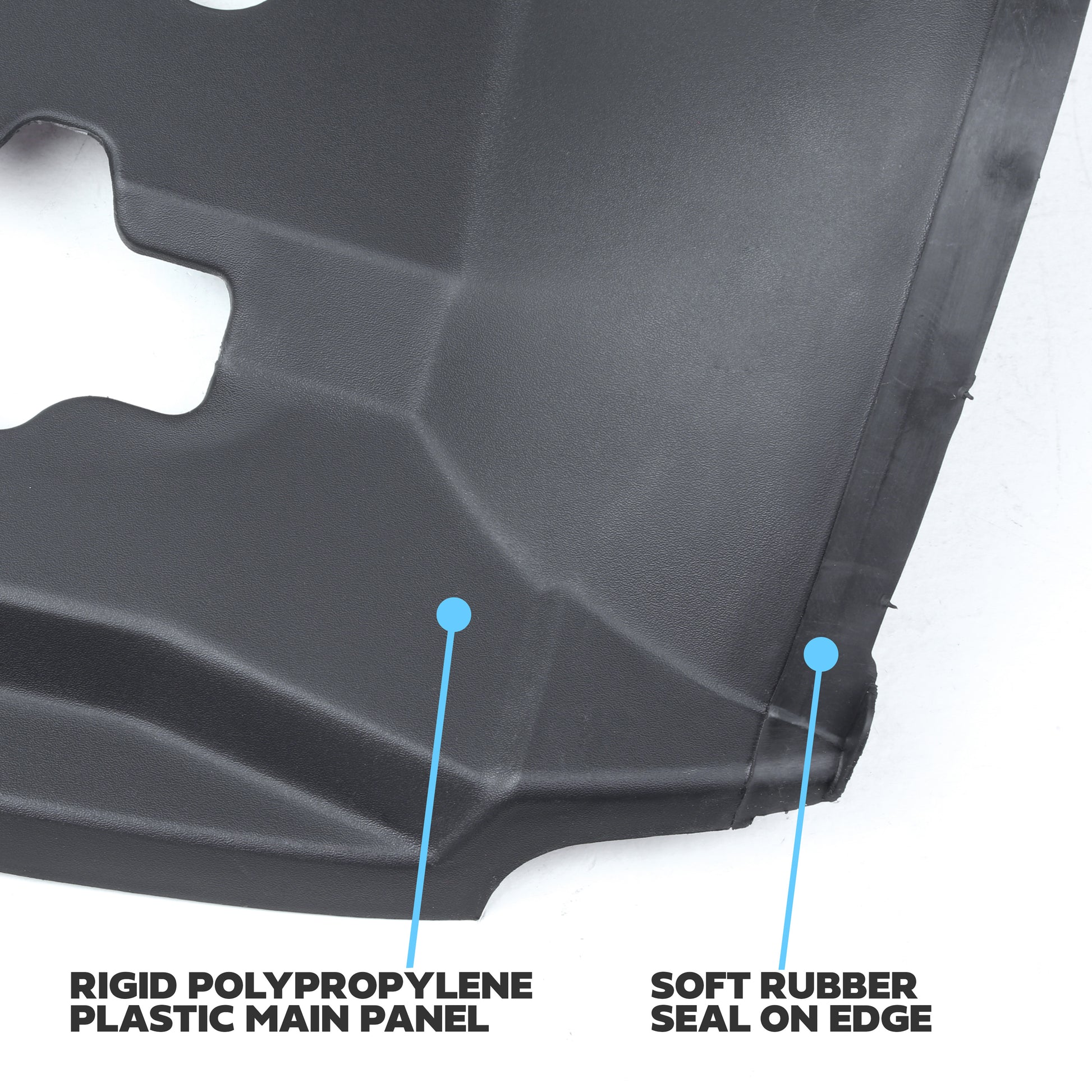 The main panel is made from rigid polypropylene (PP) plastic but also has integrated soft rubber seals moulded along the front, left and right edges.