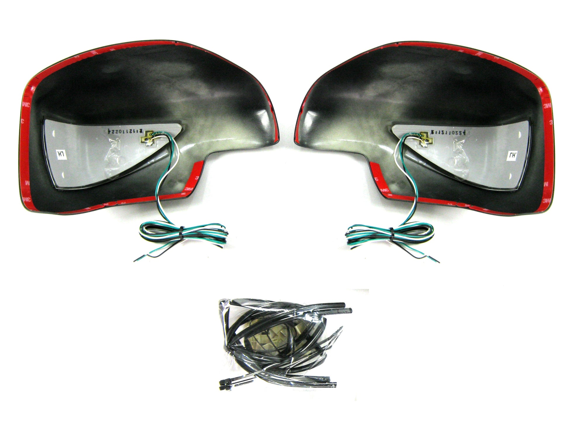 This listing is for a PAIR of mirror covers complete with pre-applied automotive grade adhesive tape and pre-clean wipe / wires / connectors.