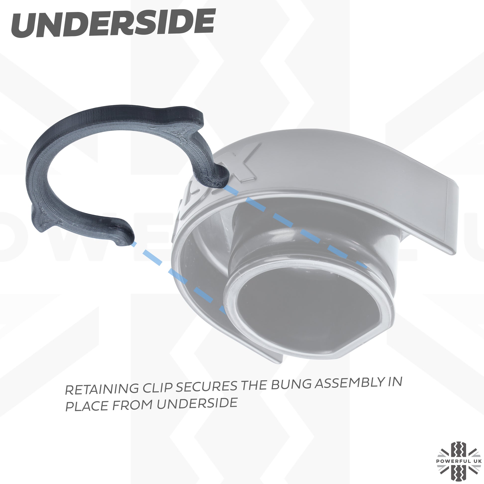The bungs are made from injection moulded ABS plastic, and the retaining clip is 3D printed by us.