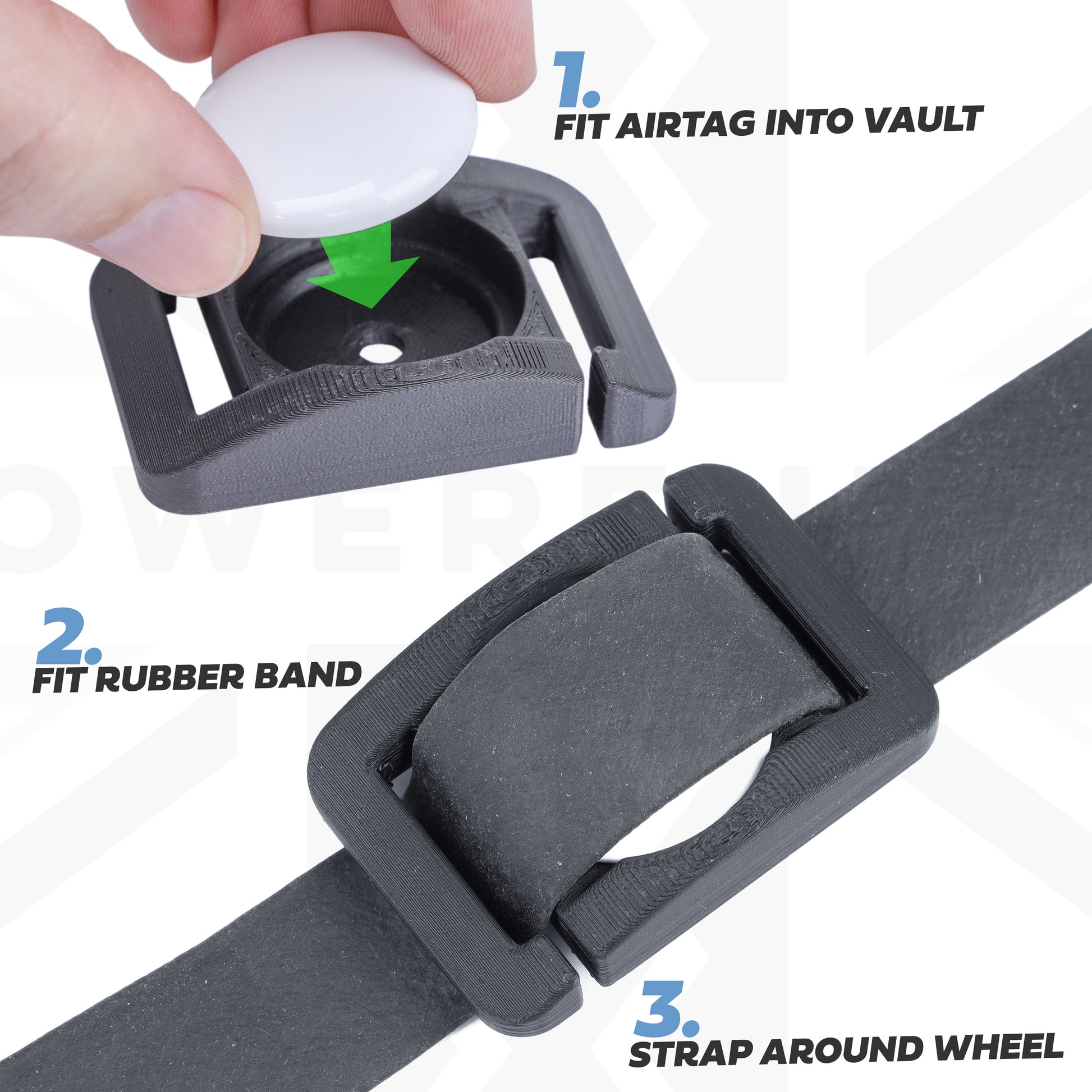 This kit includes a custom designed 3D printed holder and a heavy duty rubber band (suitable for 18" wheel and bigger).