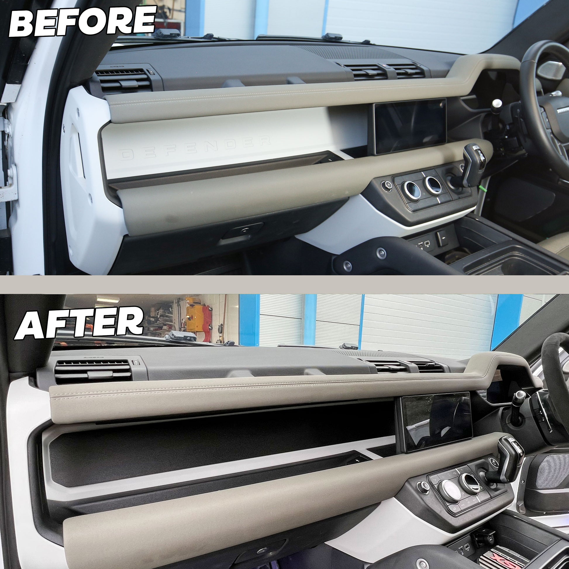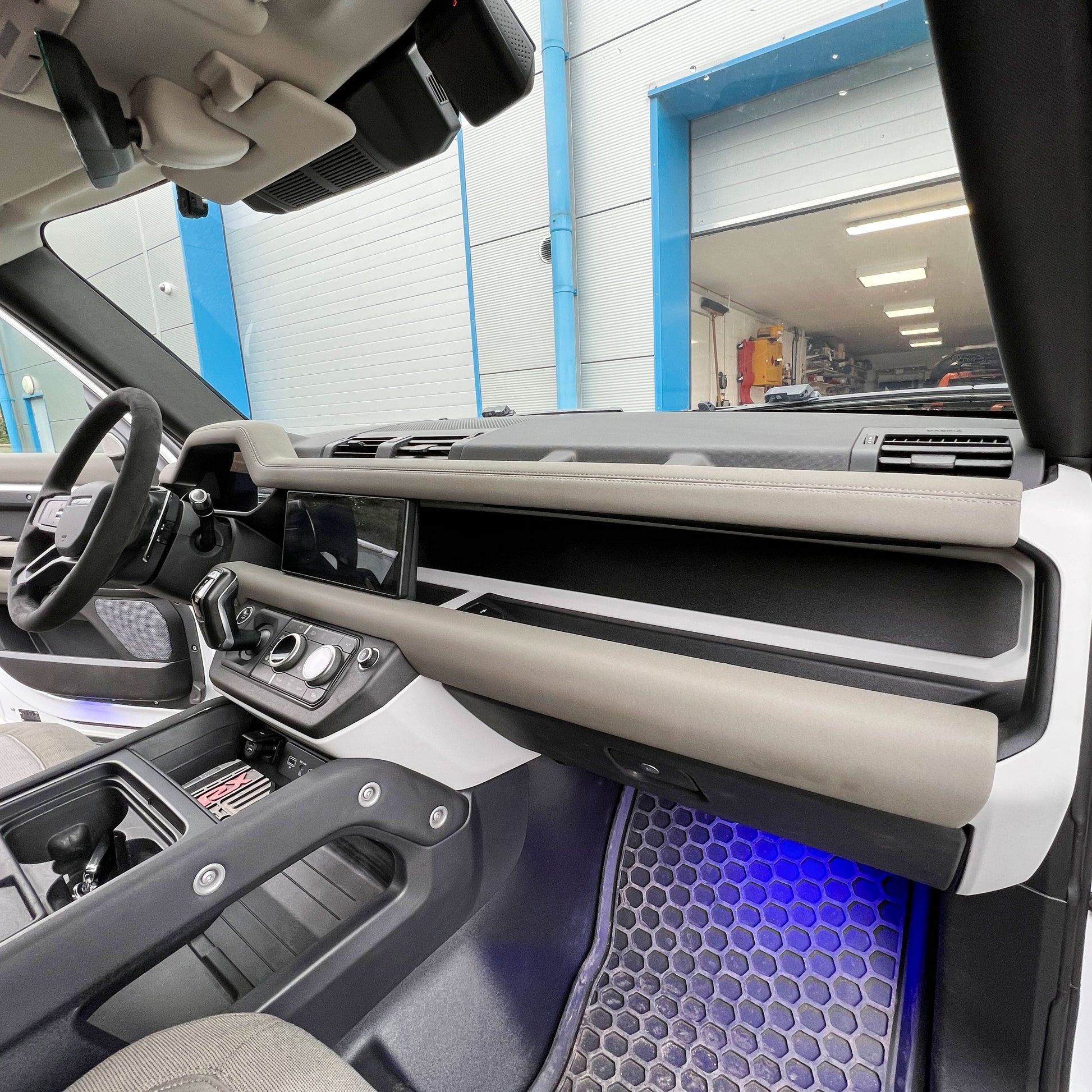 This is an aluminium dashboard fascia kit for the Land Rover Defender L663 (LHD = USA etc).
