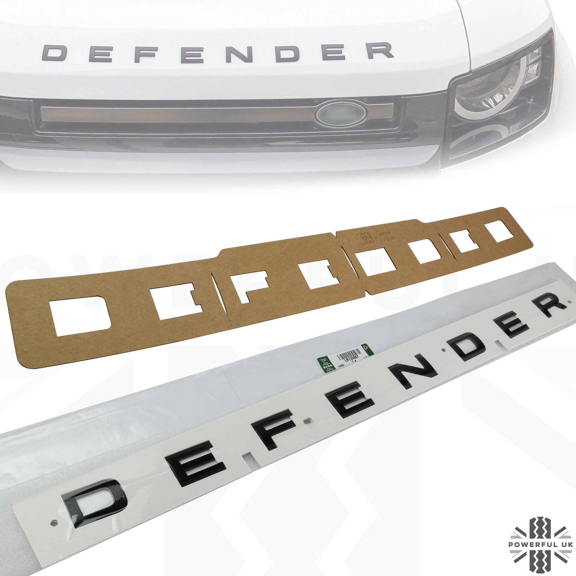 This is a set of genuine Narvik Black (Gloss Black) bonnet lettering for the Land Rover Defender L663.