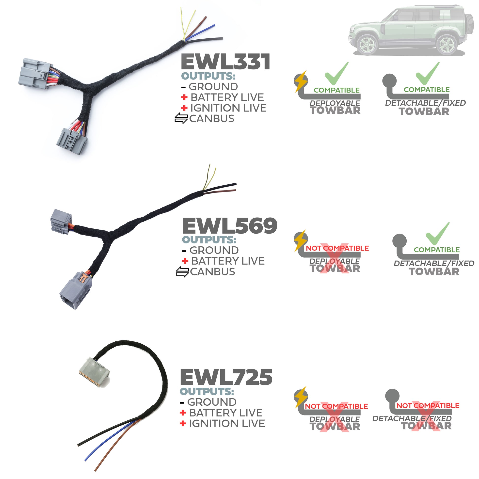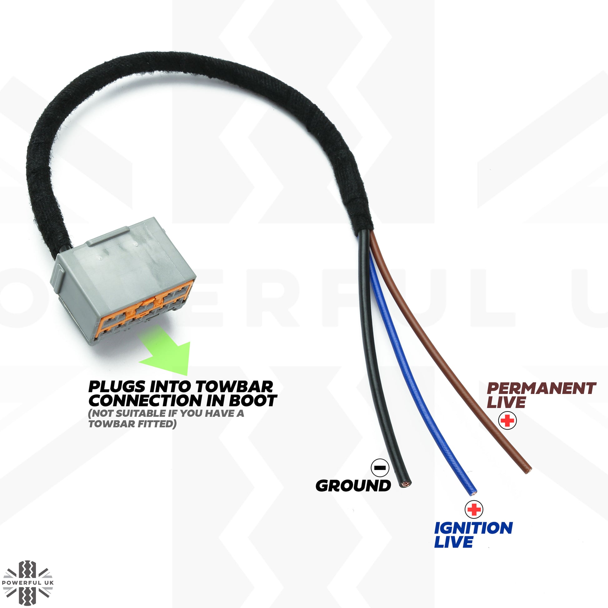 The loom plugs into the towbar power plug that all vehicles have located in the boot floor and will give you an ignition +ve / Battery +ve and Battery -ve.