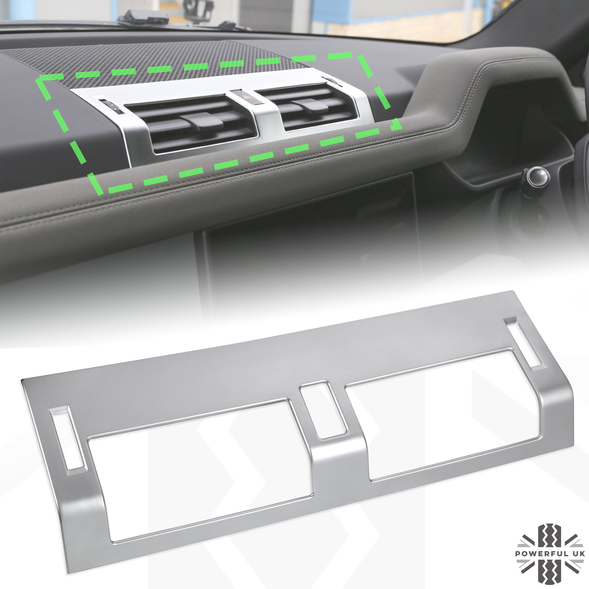 This listing is for a silver/matt chrome centre air vent panel cover for the Defender L663.