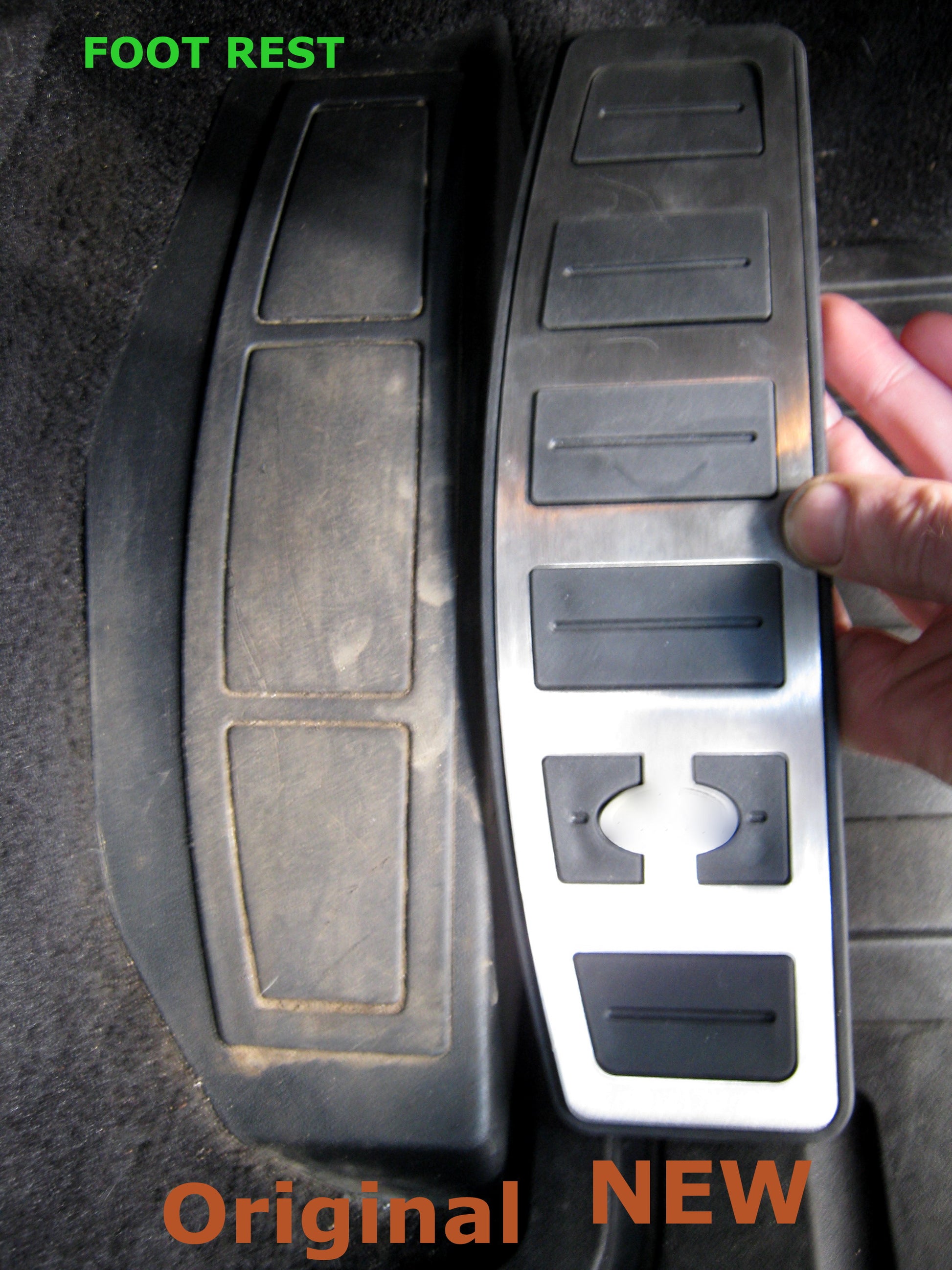 This is a 3pc kit which contains brake and accelerator pedal covers - plus a footrest plate which is self adhesive and simply sticks in place over the standard plastic area.