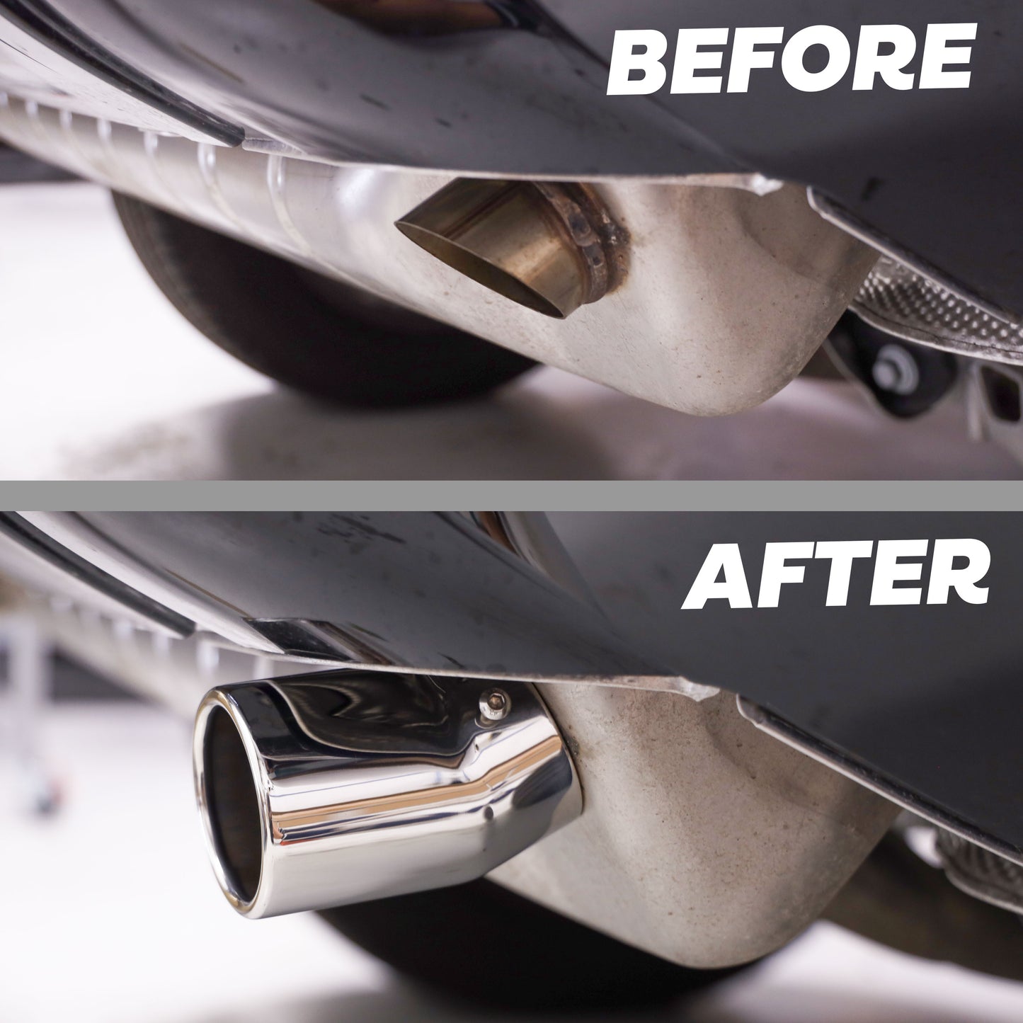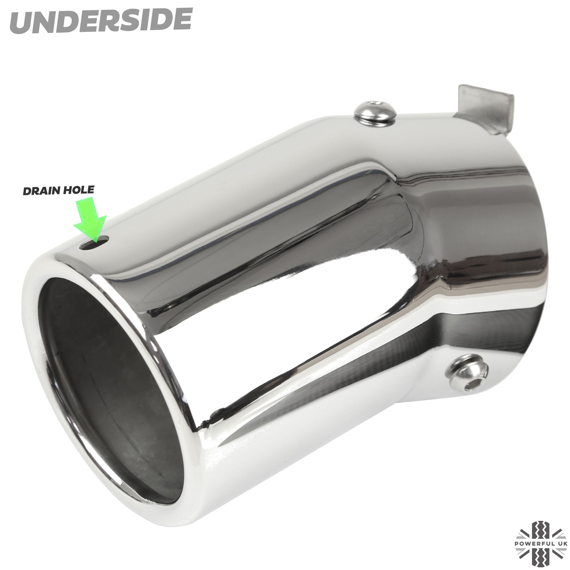 These exhaust tips also feature a drain hole on the underside to prevent them holding water.