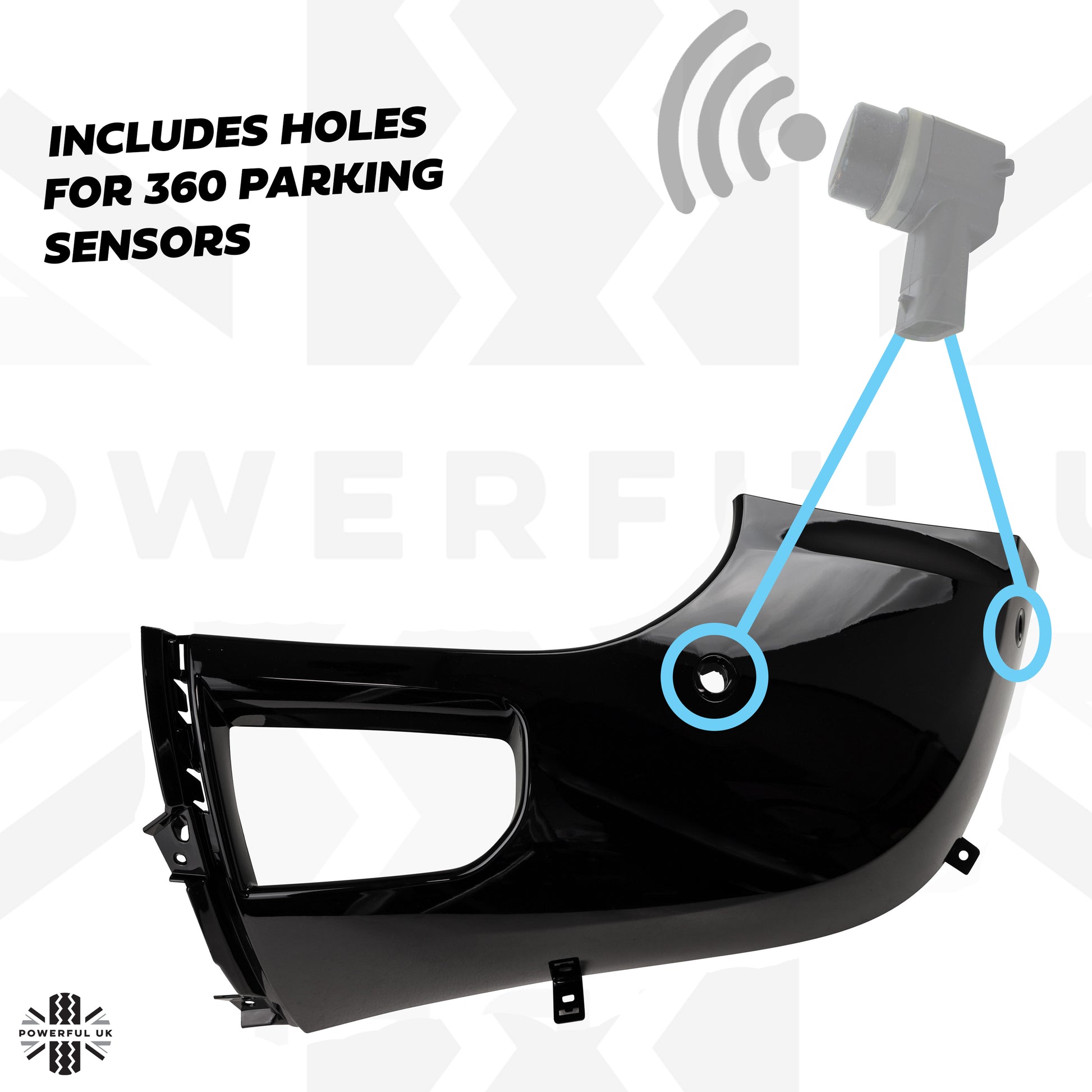 This bumper corner includes the 2 holes (and brackets) for the '360 parking aid' sensors (most models seem to have these) - so please check you require these before ordering.
