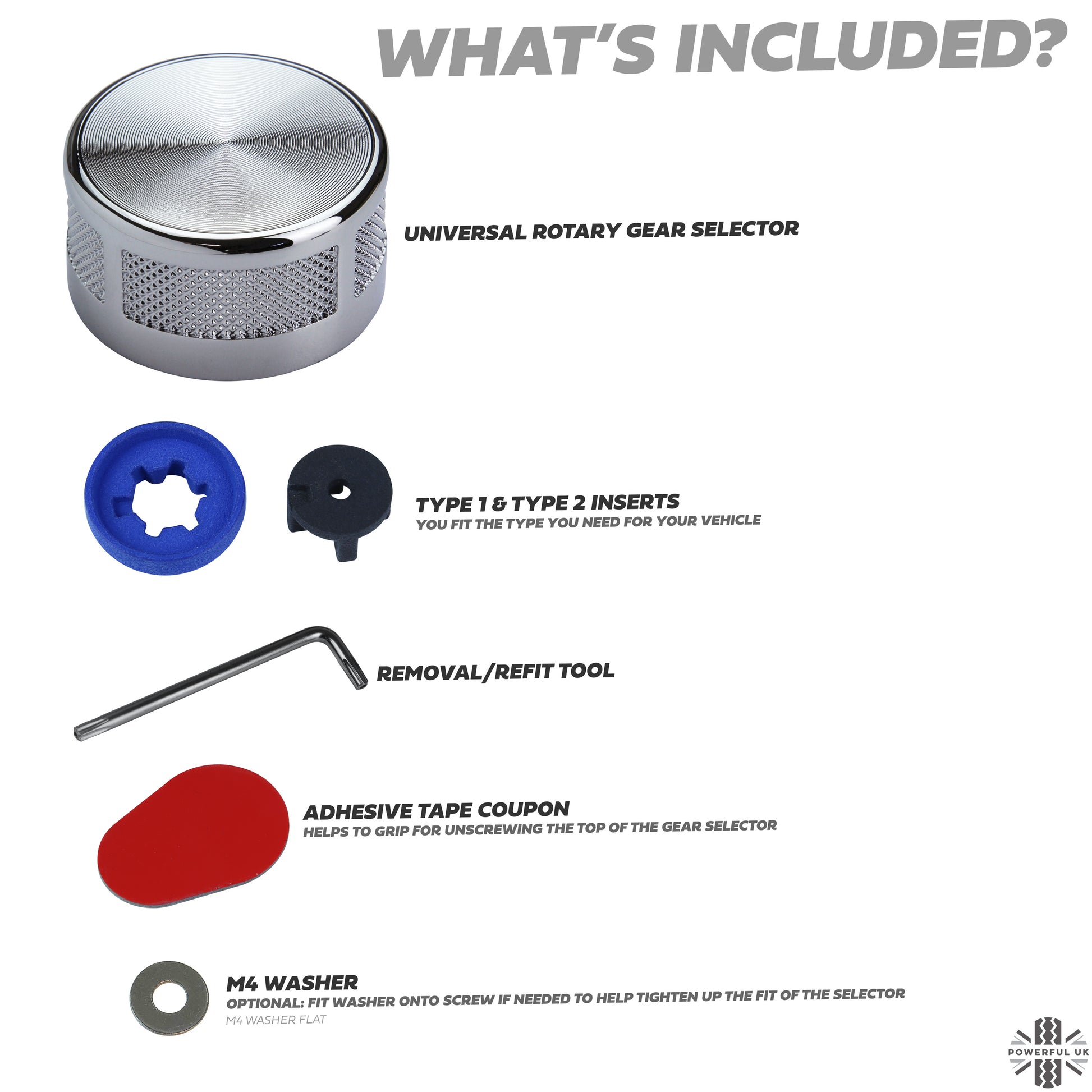 These heavyweight solid metal gear selectors come with 2 inserts - you just fit whichever insert for your vehicle.