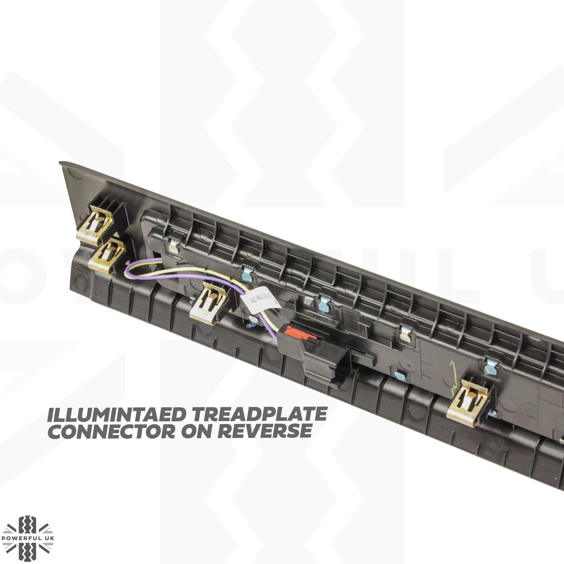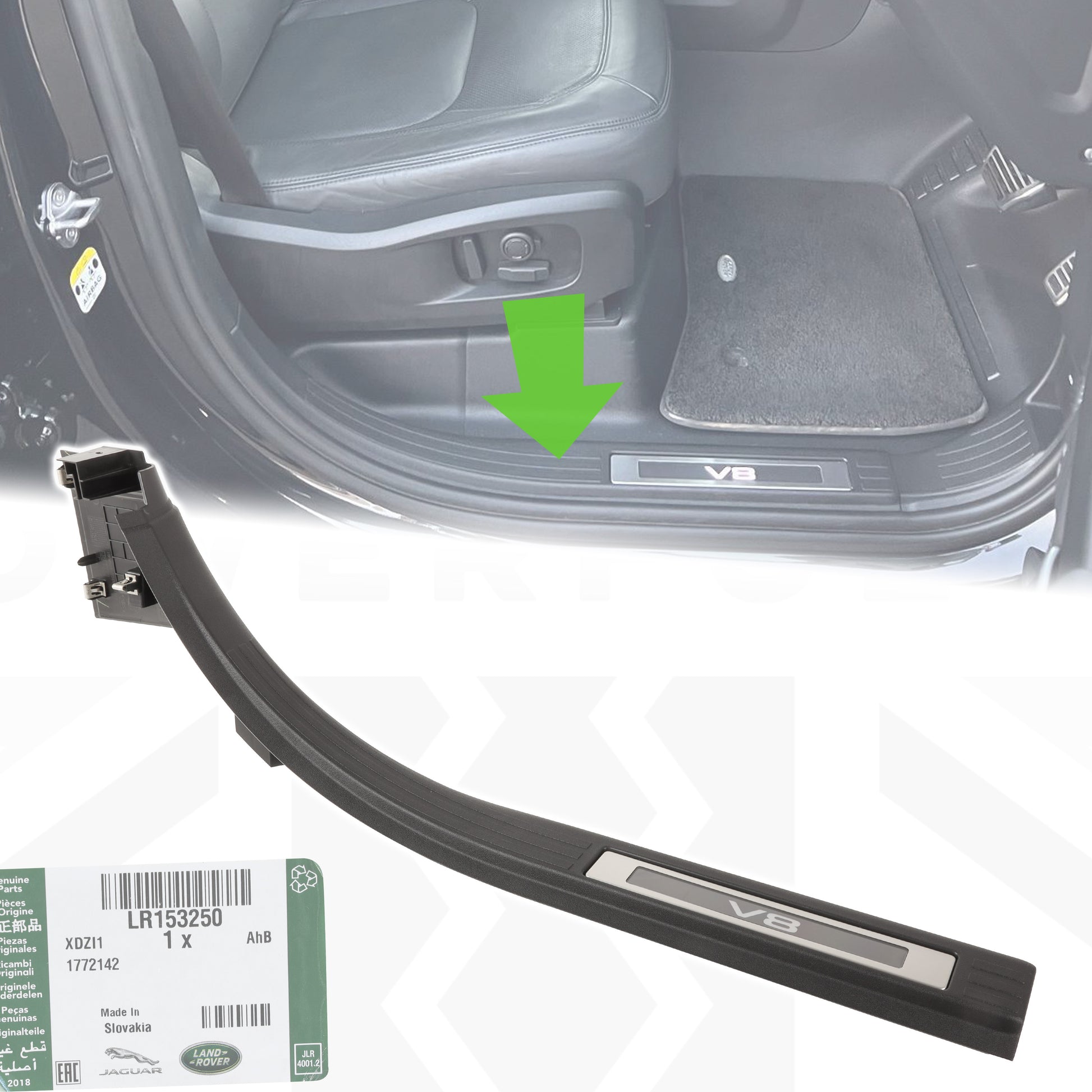 This listing is for a genuine Land Rover illuminated V8 scuff plate for the Land Rover Defender L663.