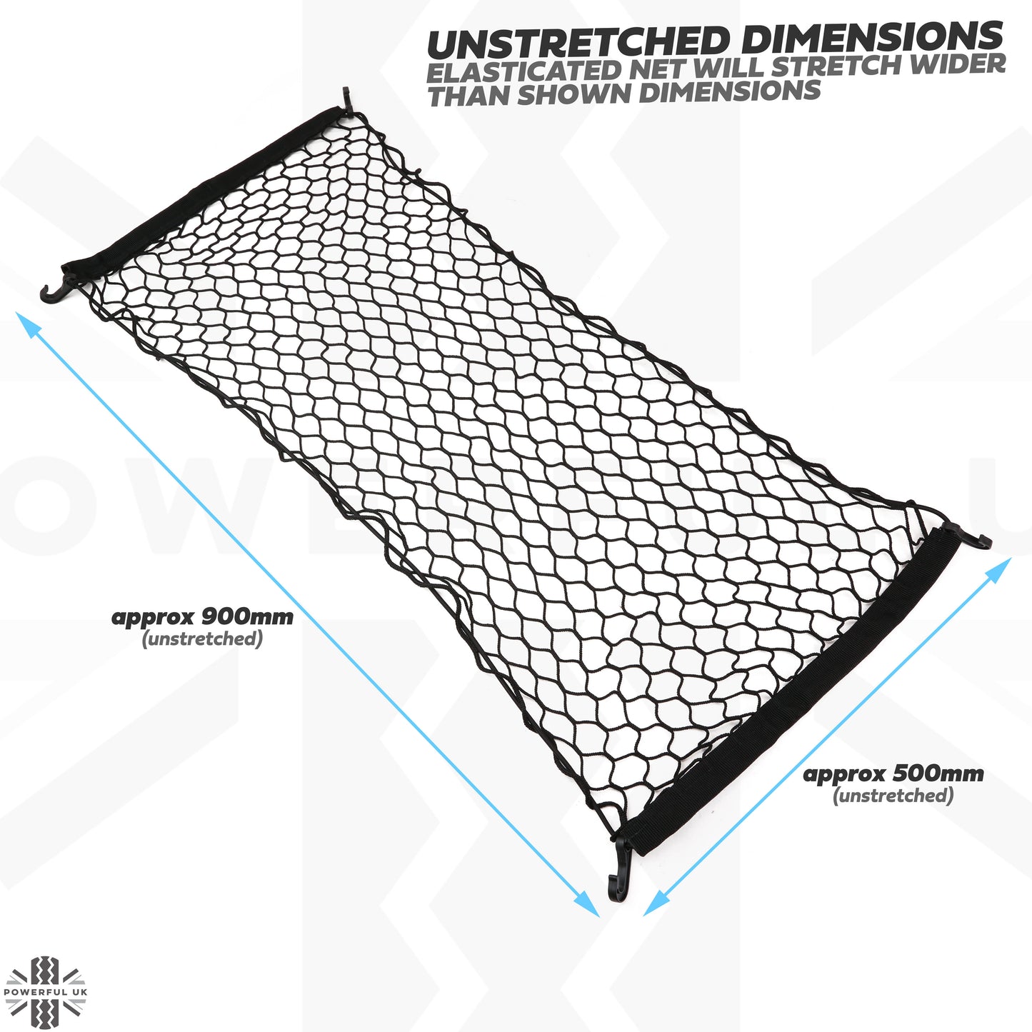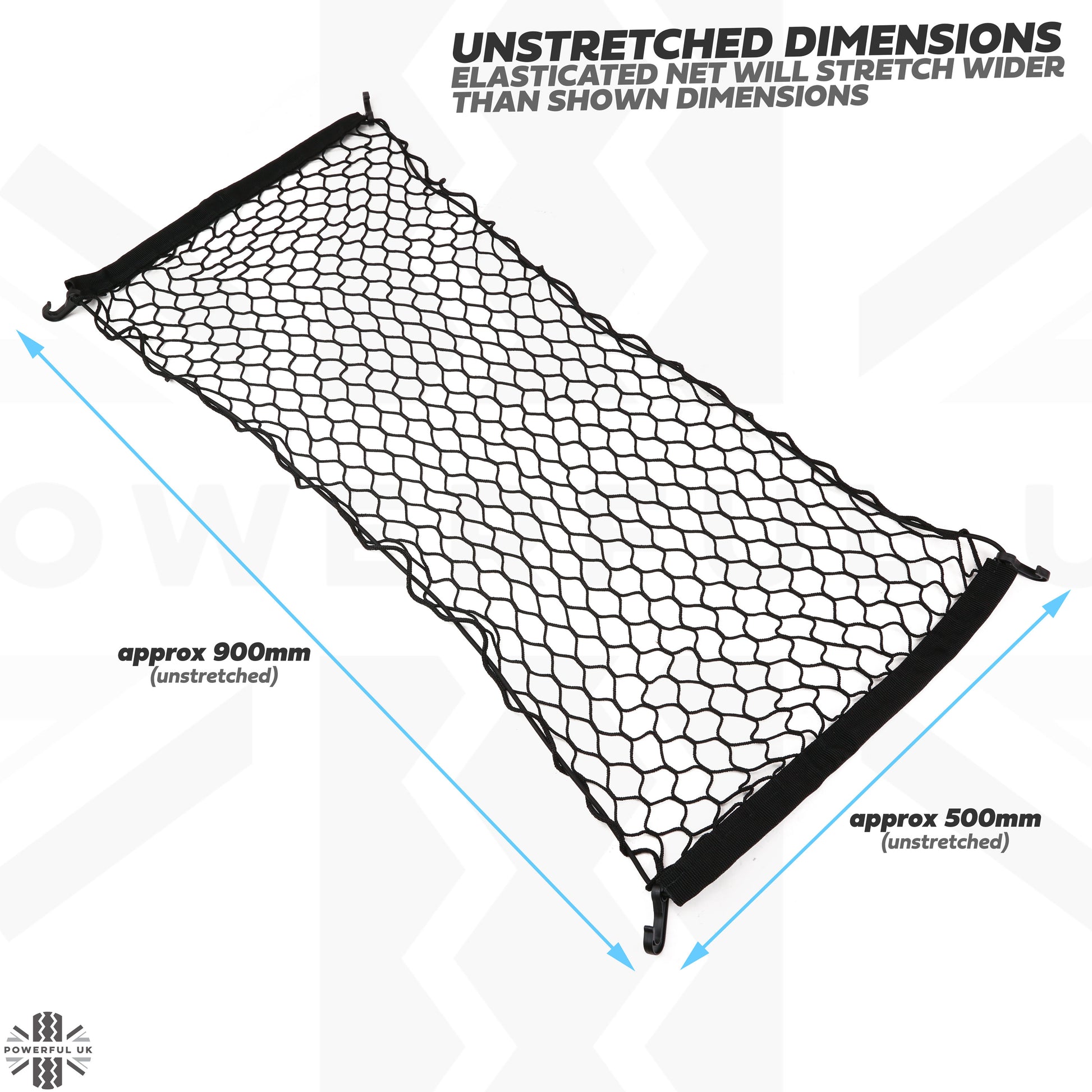 The unstretched net measures approx 900mm x 500mm.
