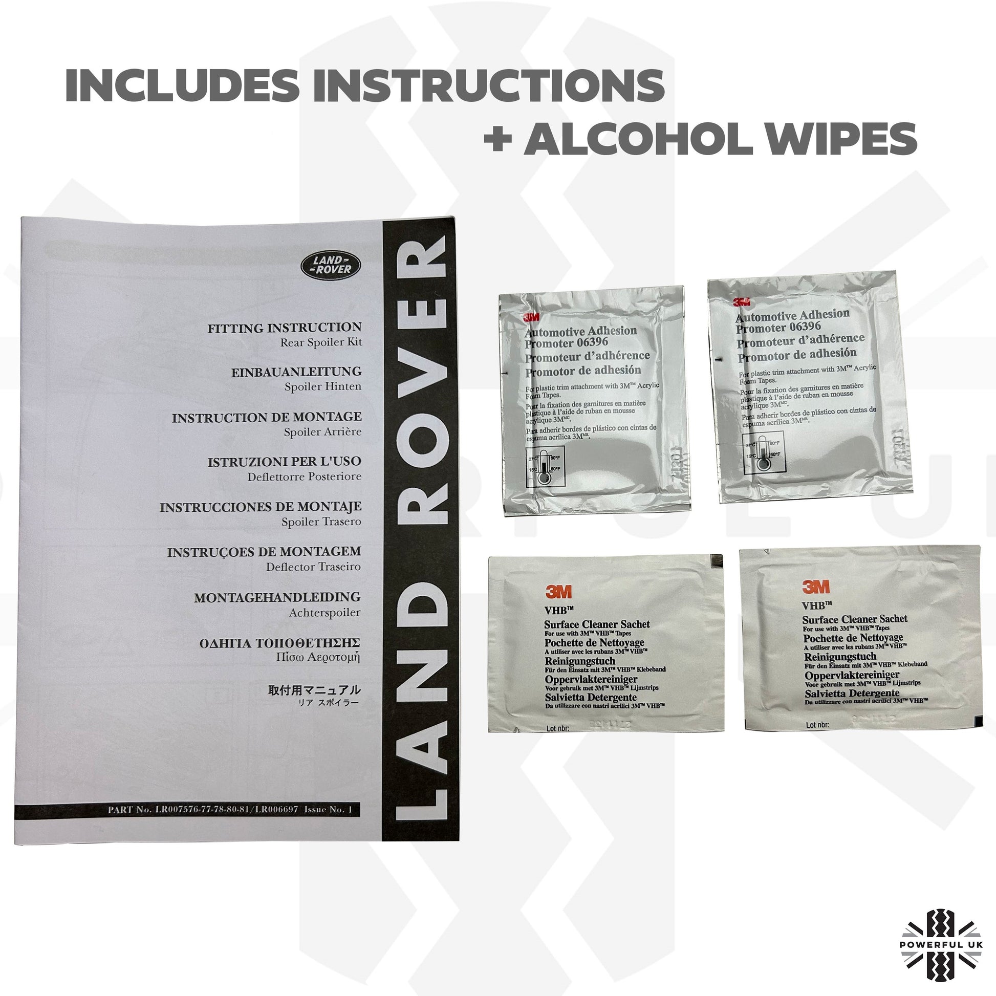 Land Rover also include fitting instructions as well as 2x alcohol wipes and 2x adhesion promotors with this spoiler.