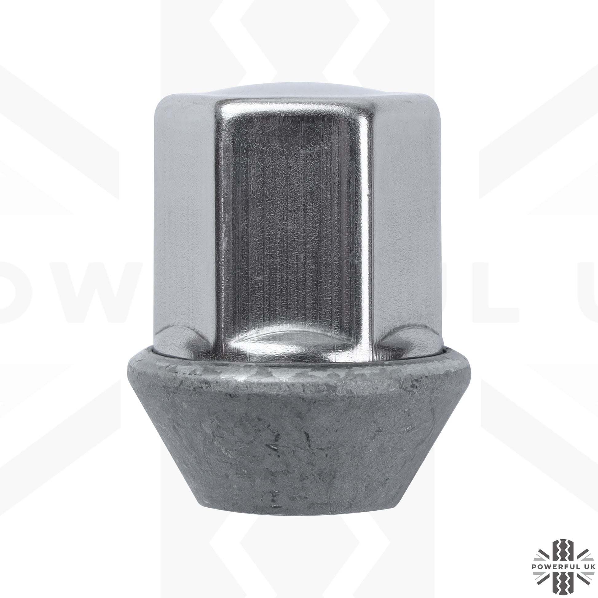 These wheels nuts are forged from high strength steel and have a bright stainless steel cap (to resist corrosion).