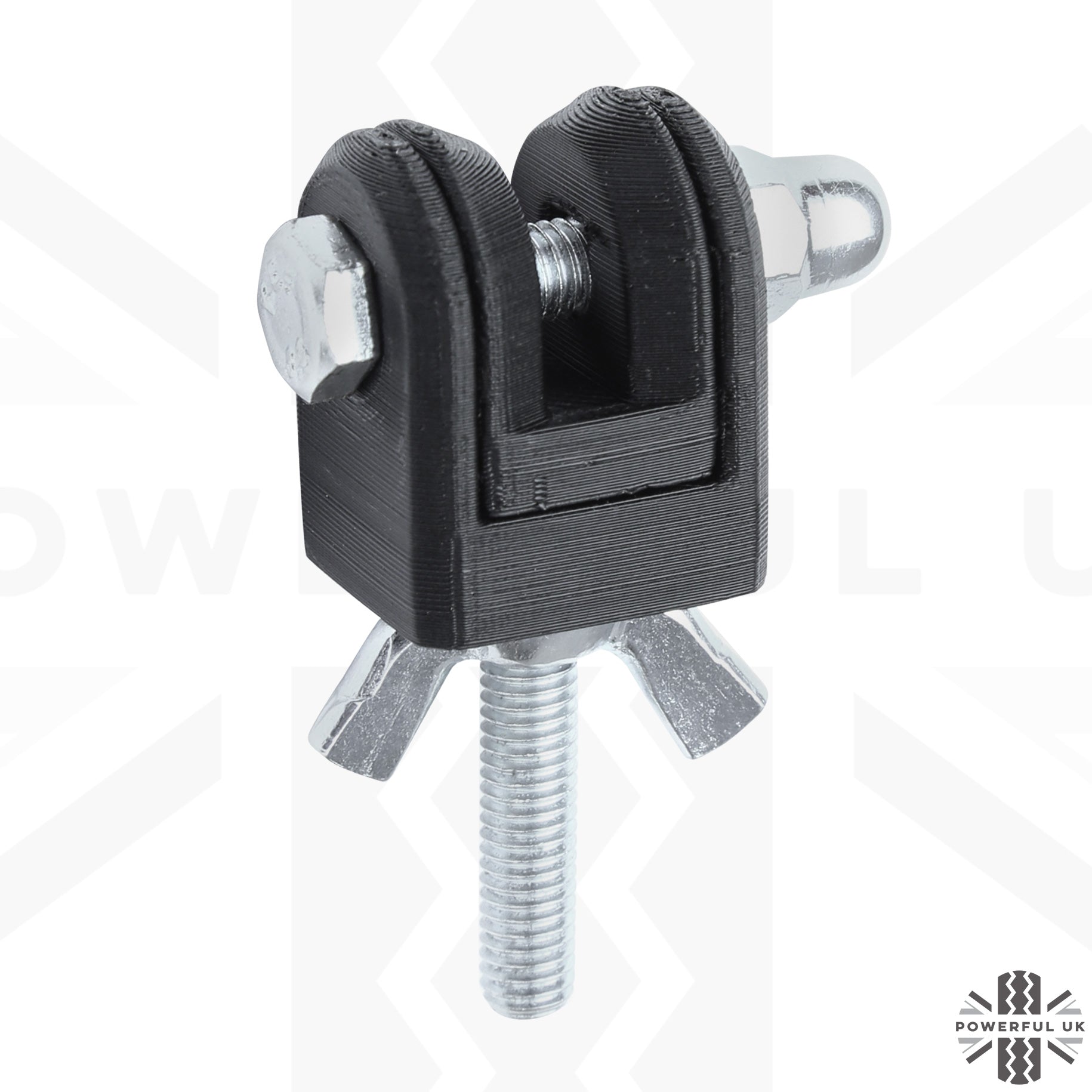The clip secures in place with a wing nut rather than a barbed clip which makes future removal/refitting and less prone to breakage.