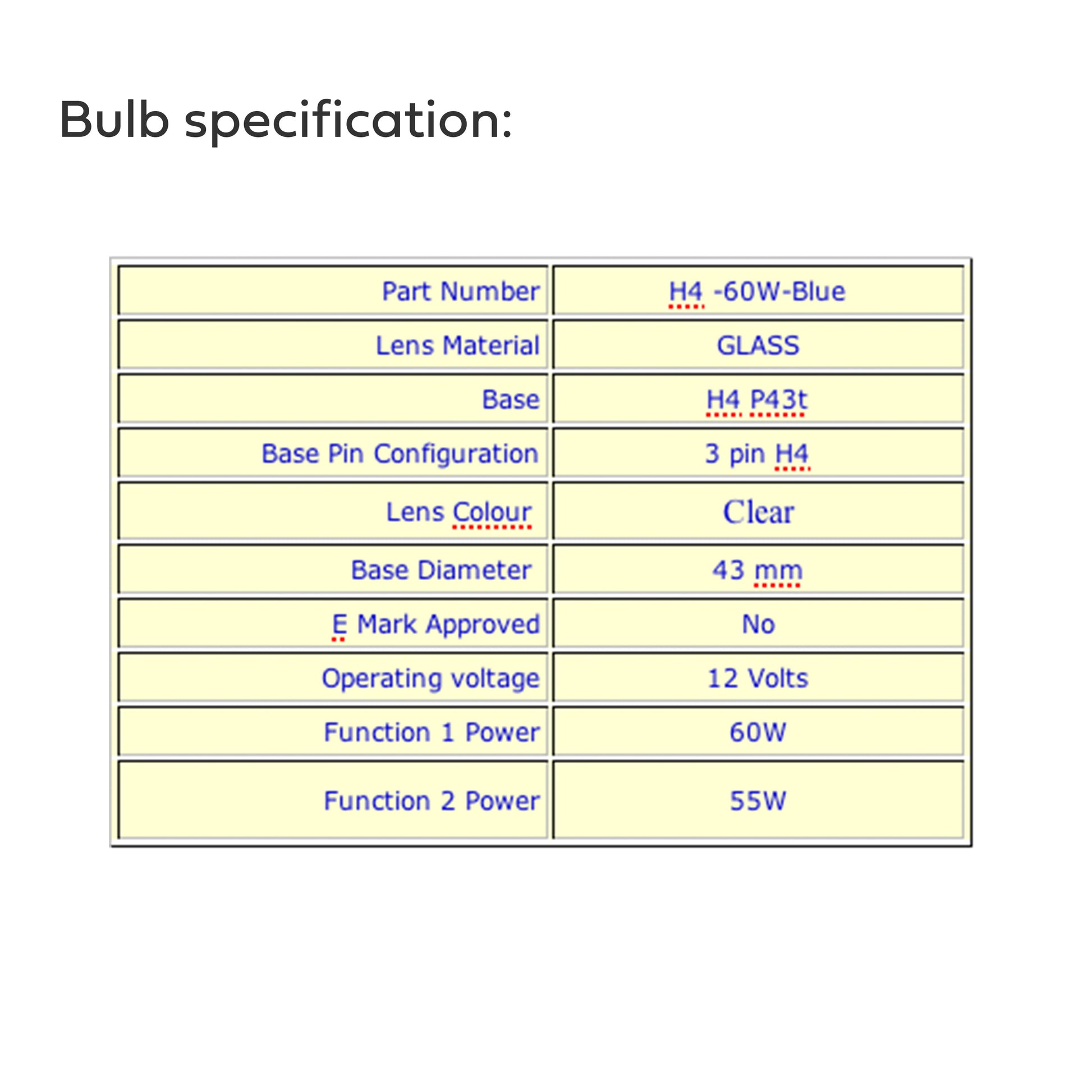 The H4 bulb has double filaments inside the lamp and produces light for the MAIN and DIPPED beam headlamp functions.