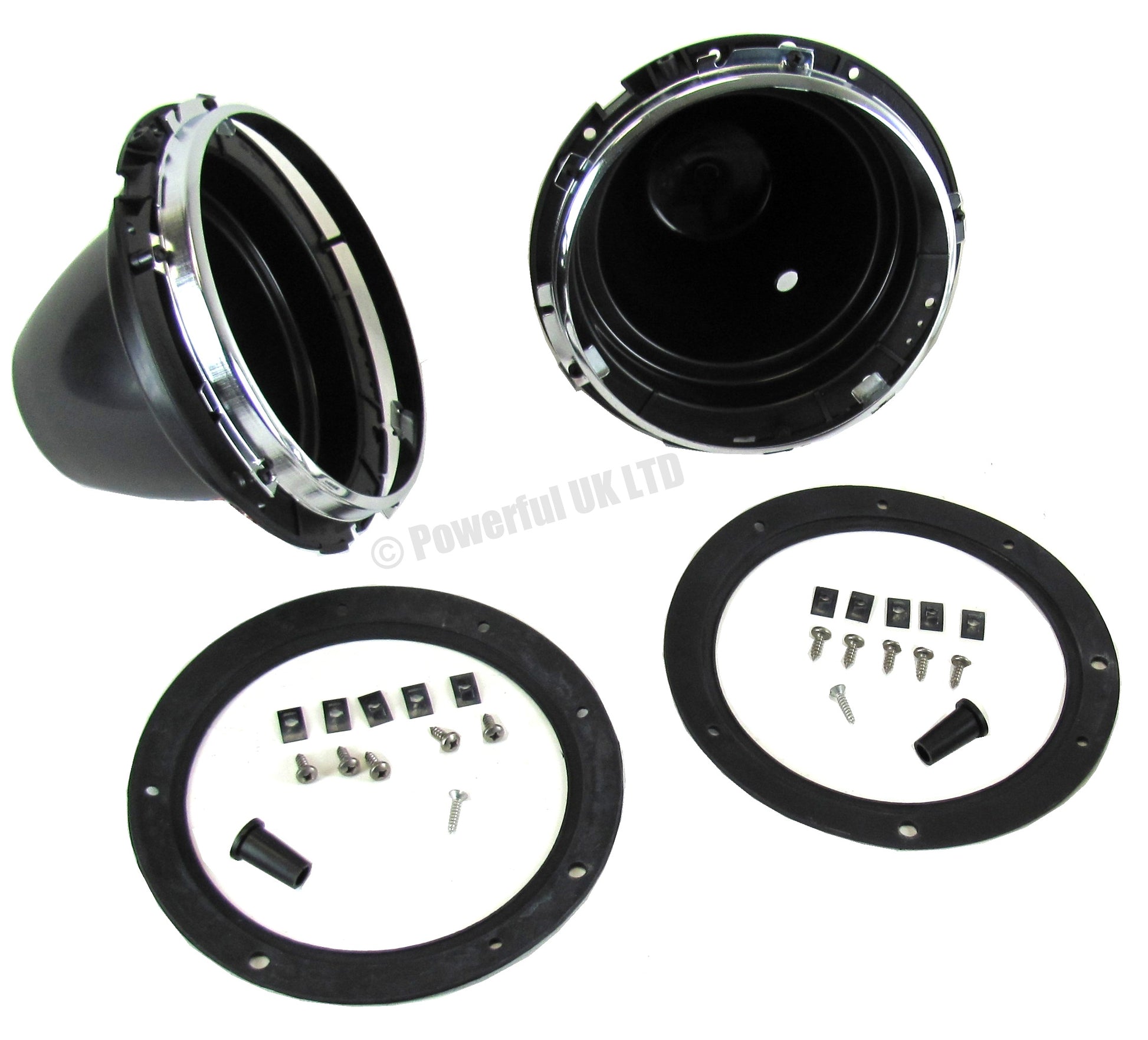 - 2 x Plastic Headlight bowls with inner chrome ring and all fixings to retail the headlight in the bowl and beam adjusters.