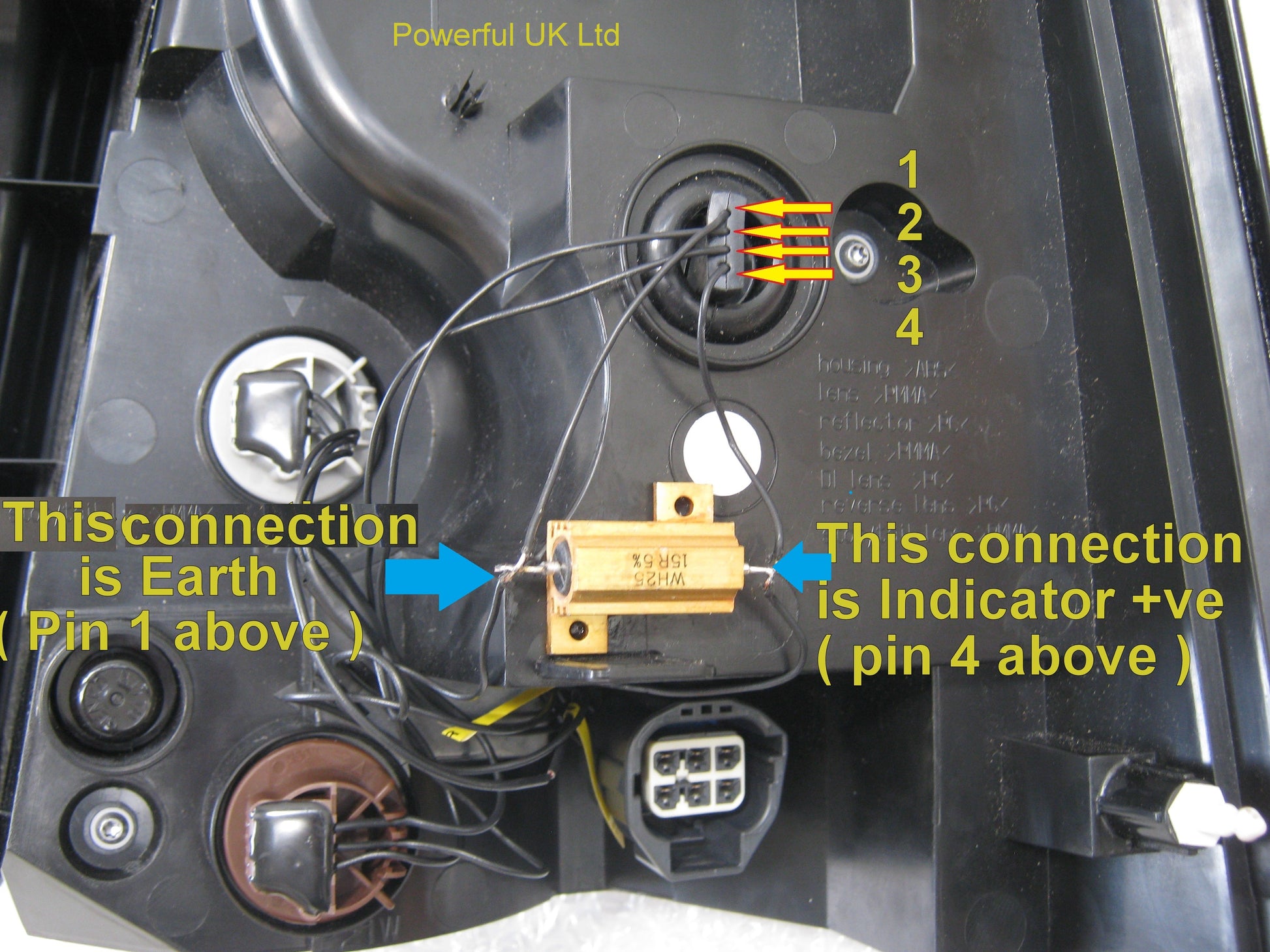 Rather than fitting to the loom side of the car it is better to glue the resistor to the rear of the lights and connect to the wires on the rear light loom this way you are not changing the main car wiring.