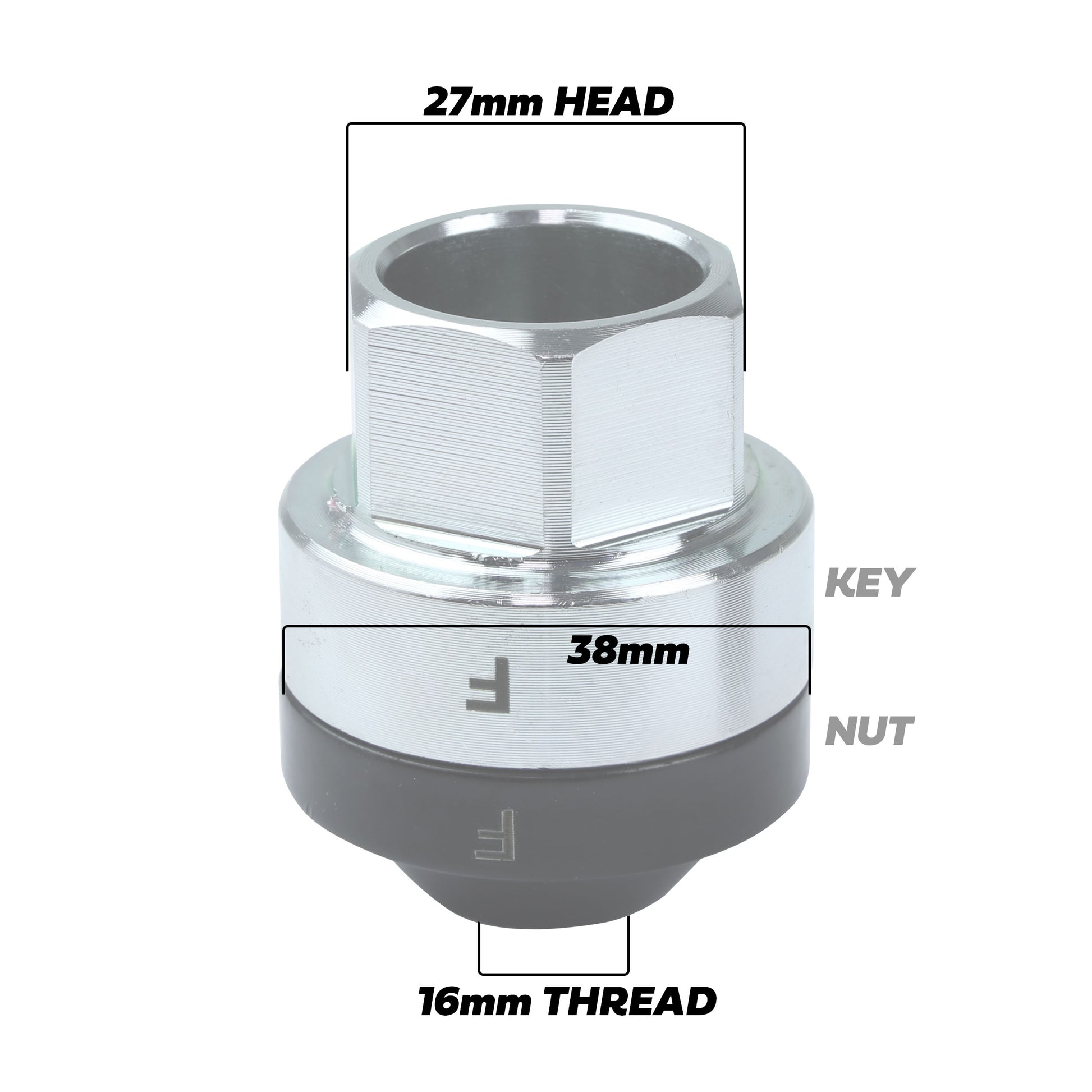 The wheel nut key has a 27mm hex head so you need a 27mm wheel brace to fit / remove these.