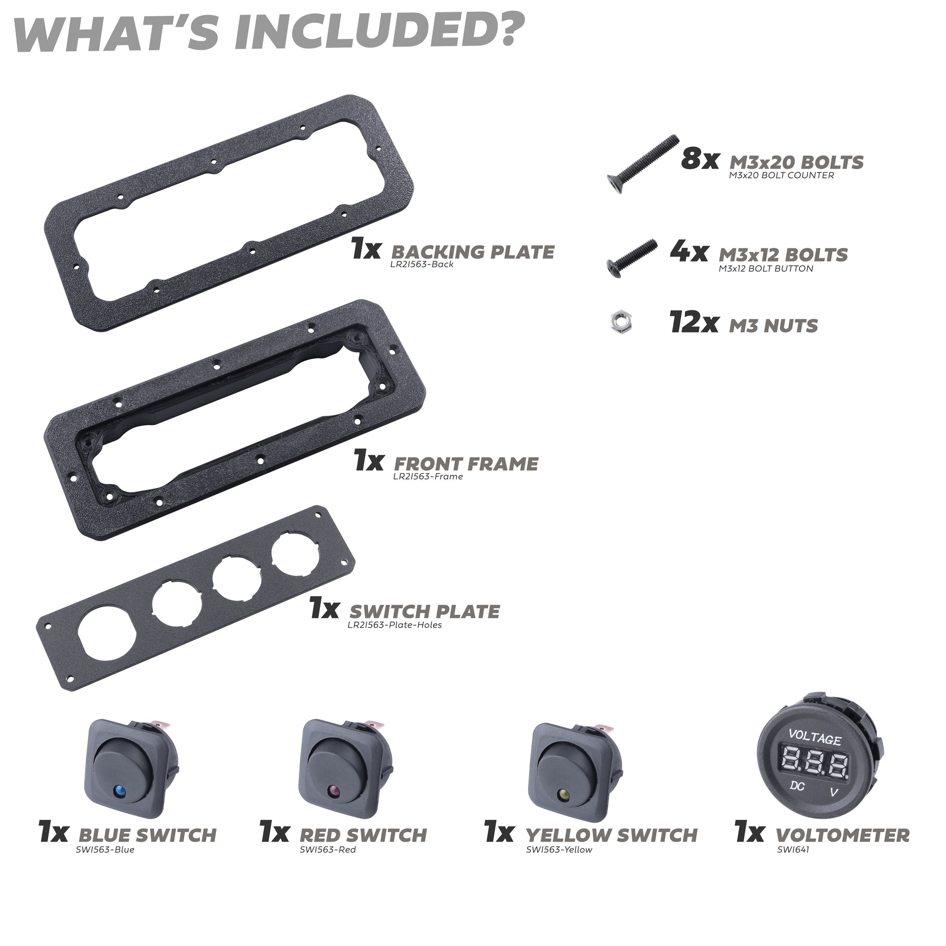 This kit includes a voltometer, plus 3 rocker switches with LED dot (1x Blue, 1x Red & 1x Yellow).