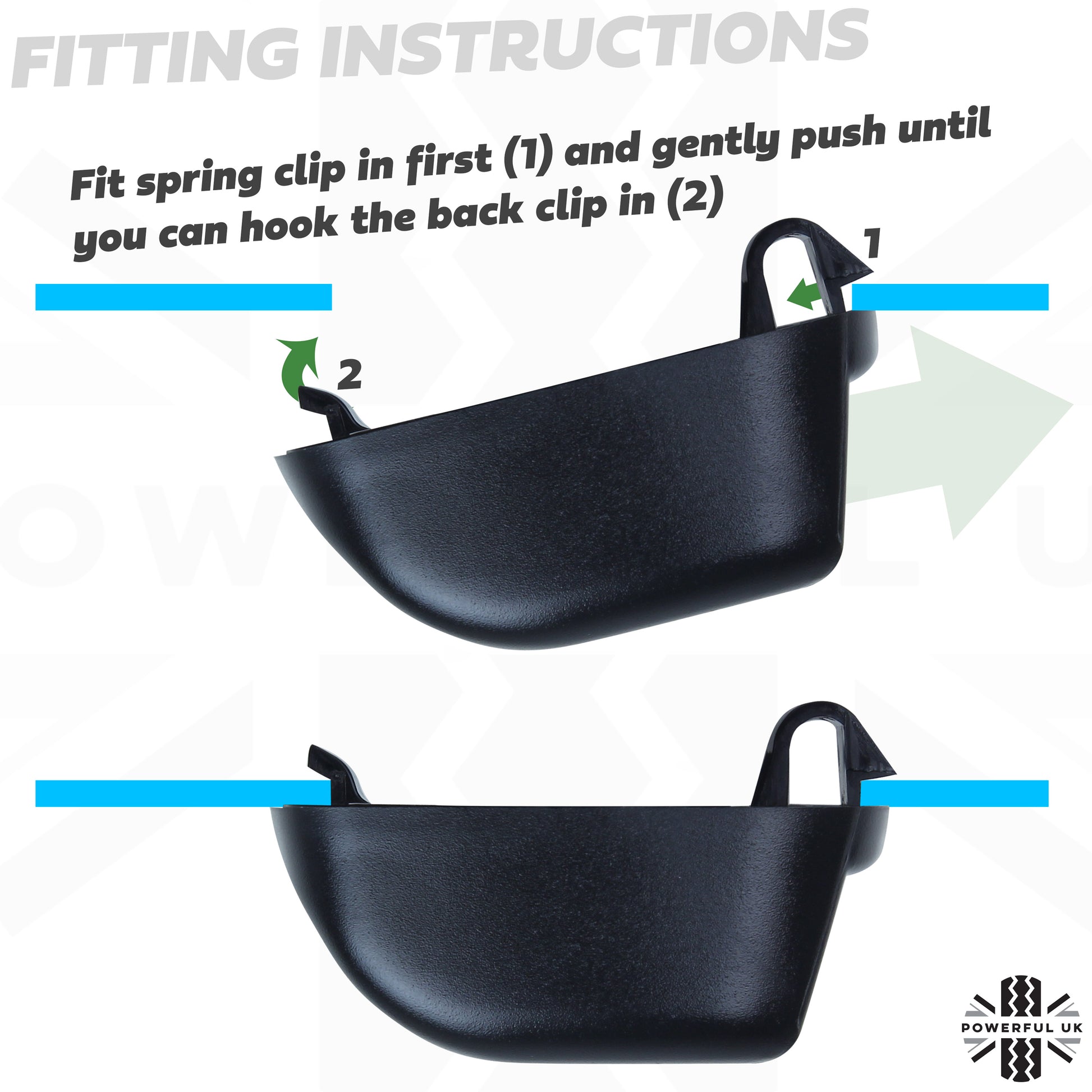 Please note the fitting diagram in the photos - when fitting, insert the spring clip first and push until you can hook the opposite clip in.