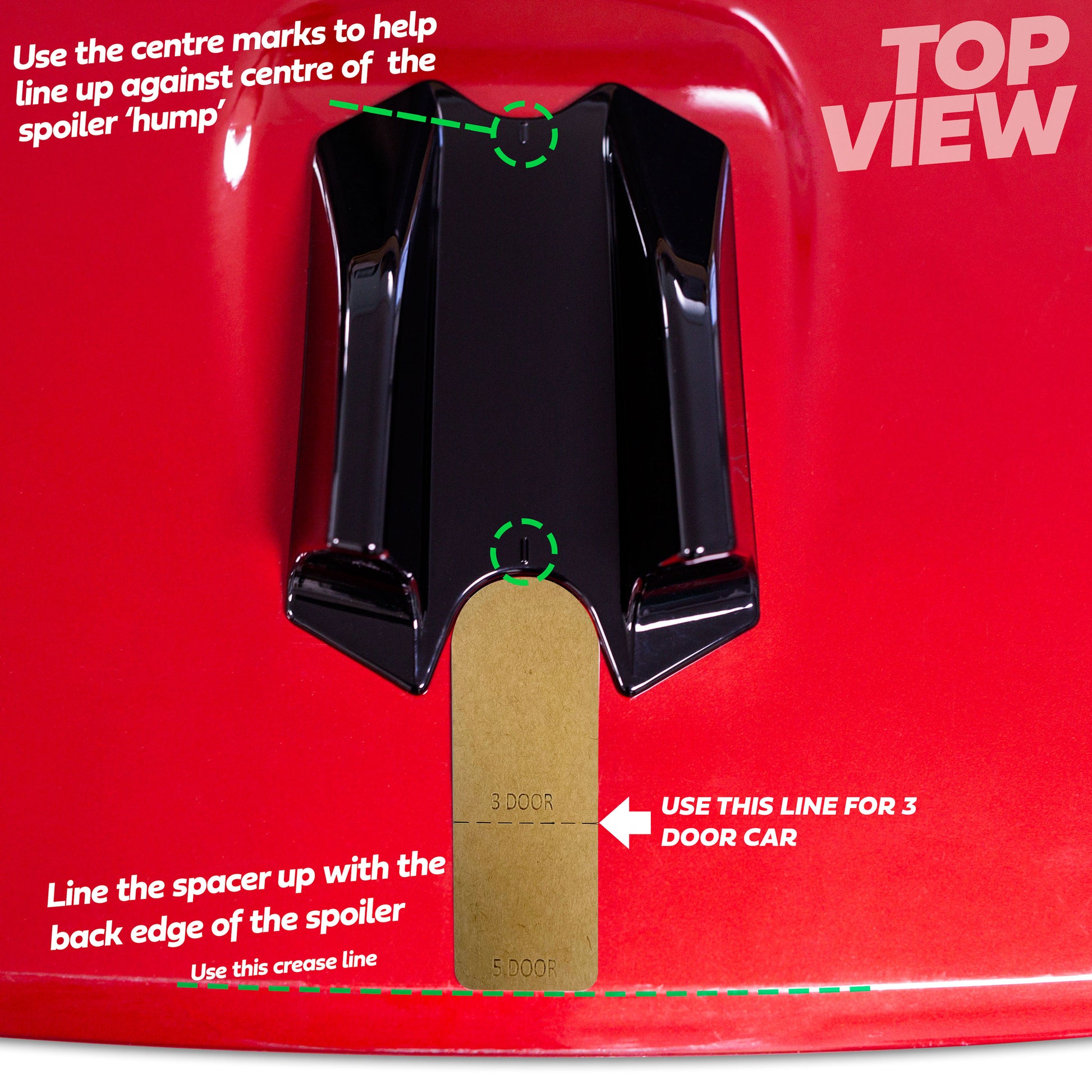 PLEASE NOTE: We have had a couple of reports of a slightly different spoiler design out there - we've sold hundreds of these aerials and it has only affected 2 so far! We advise test fitting the aerial first, to check the curvature matches. If the aerial doesn't sit flush to the spoiler, disregard the spacer template and move the aerial towards the rear of the car until a good fit is achieved.