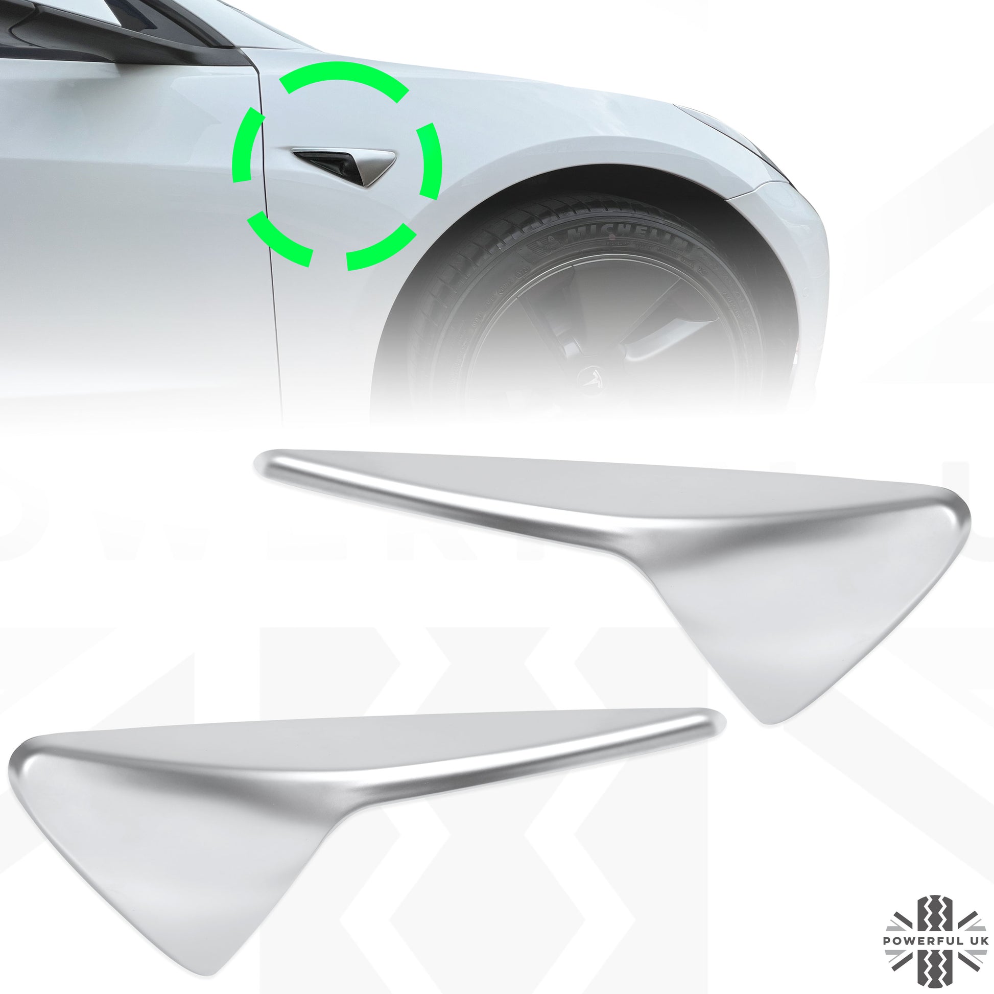 This listing is for a side repeater camera cover set in Silver/Satin Chrome for the Tesla Model S, 3, X or Y.
