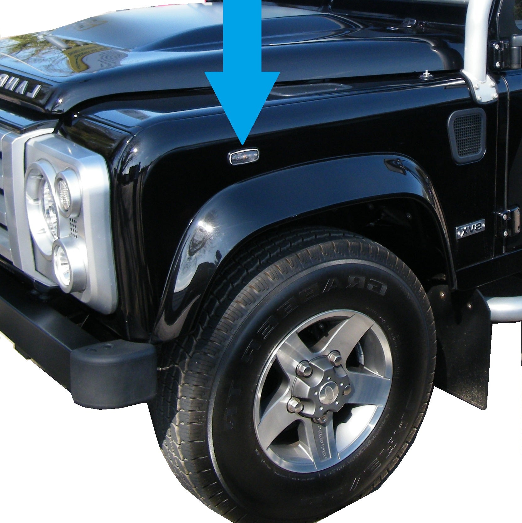 There are a few different versions of side repeaters used on the Land Rover Defender - see photo - if you have the earlier style you can't just fit the later style side repeaters as the hole in the wings are different.