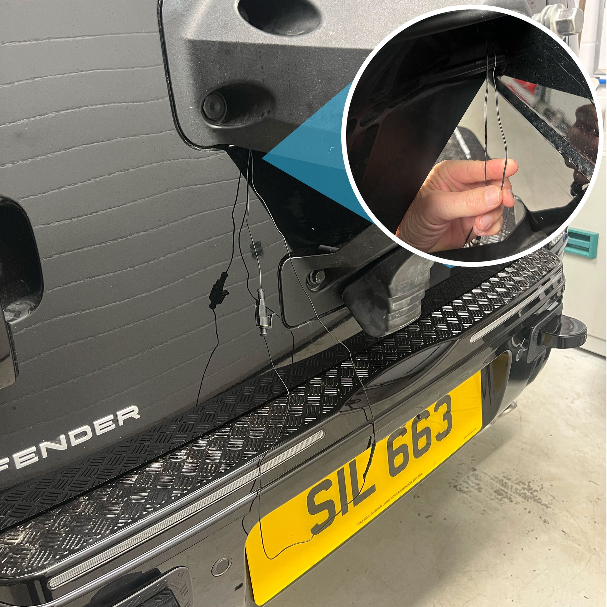 The wire loop is threaded through the spare wheel and taps into the electrics in the rear door lock mechanism using the supplied plug+play tap loom.