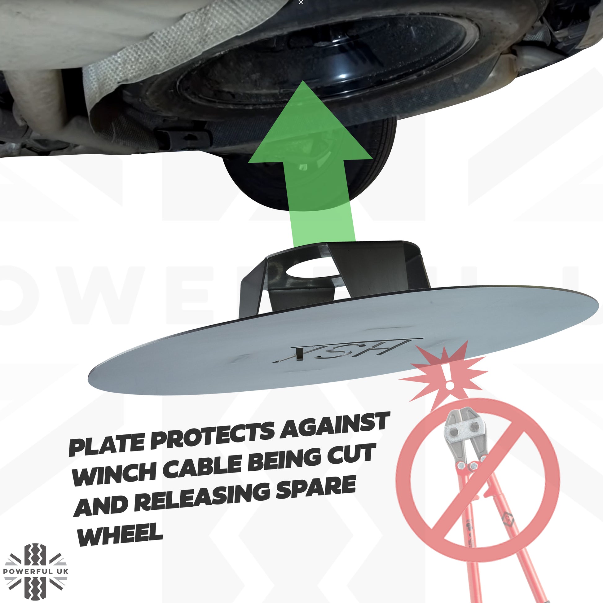 This anti-theft protection plate nests inside the spare wheel and blocks that access to the winch cable.