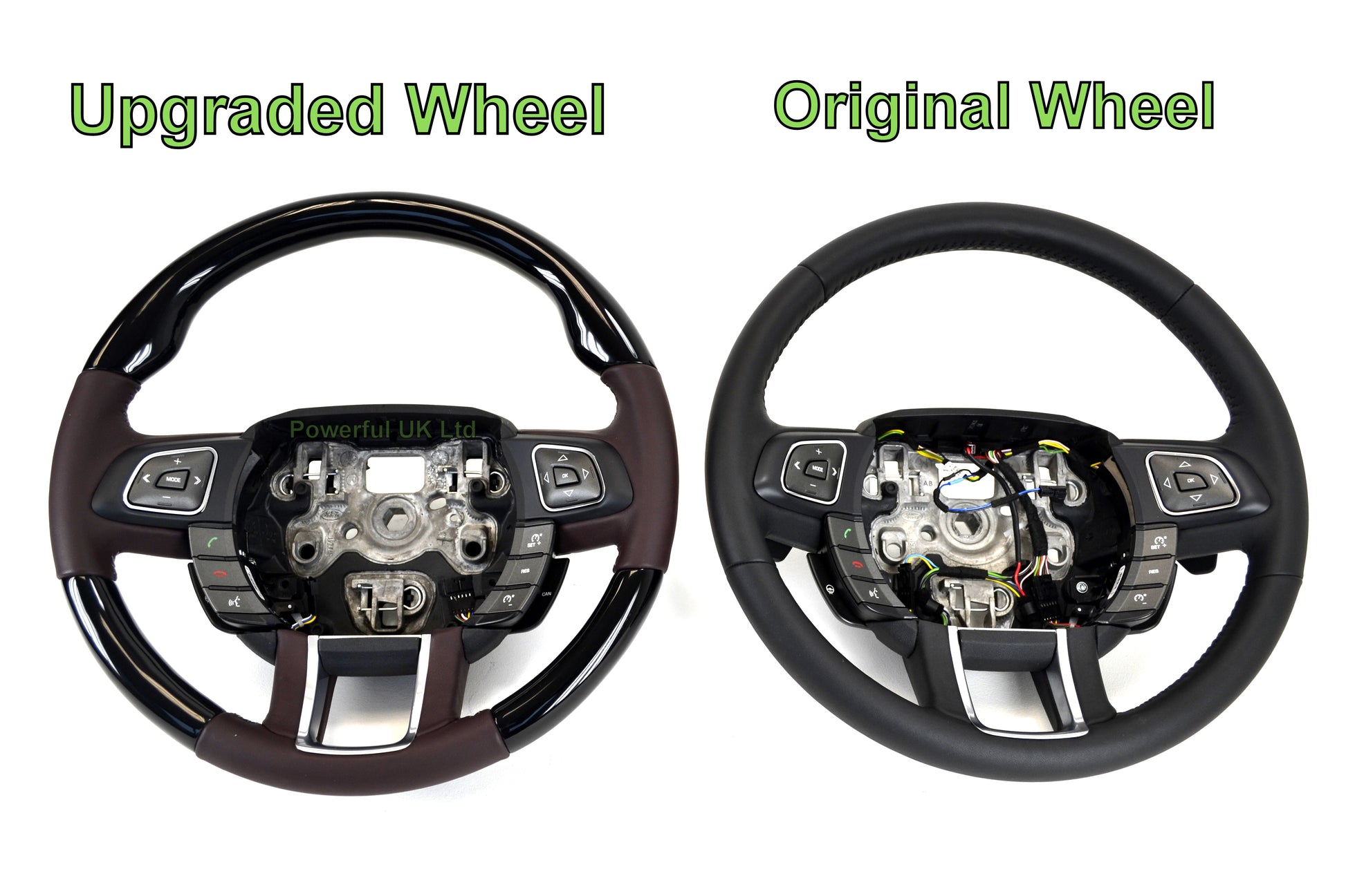 This steering wheel is a genuine Land Rover steering wheel that has been professionally refinished and retrimmed