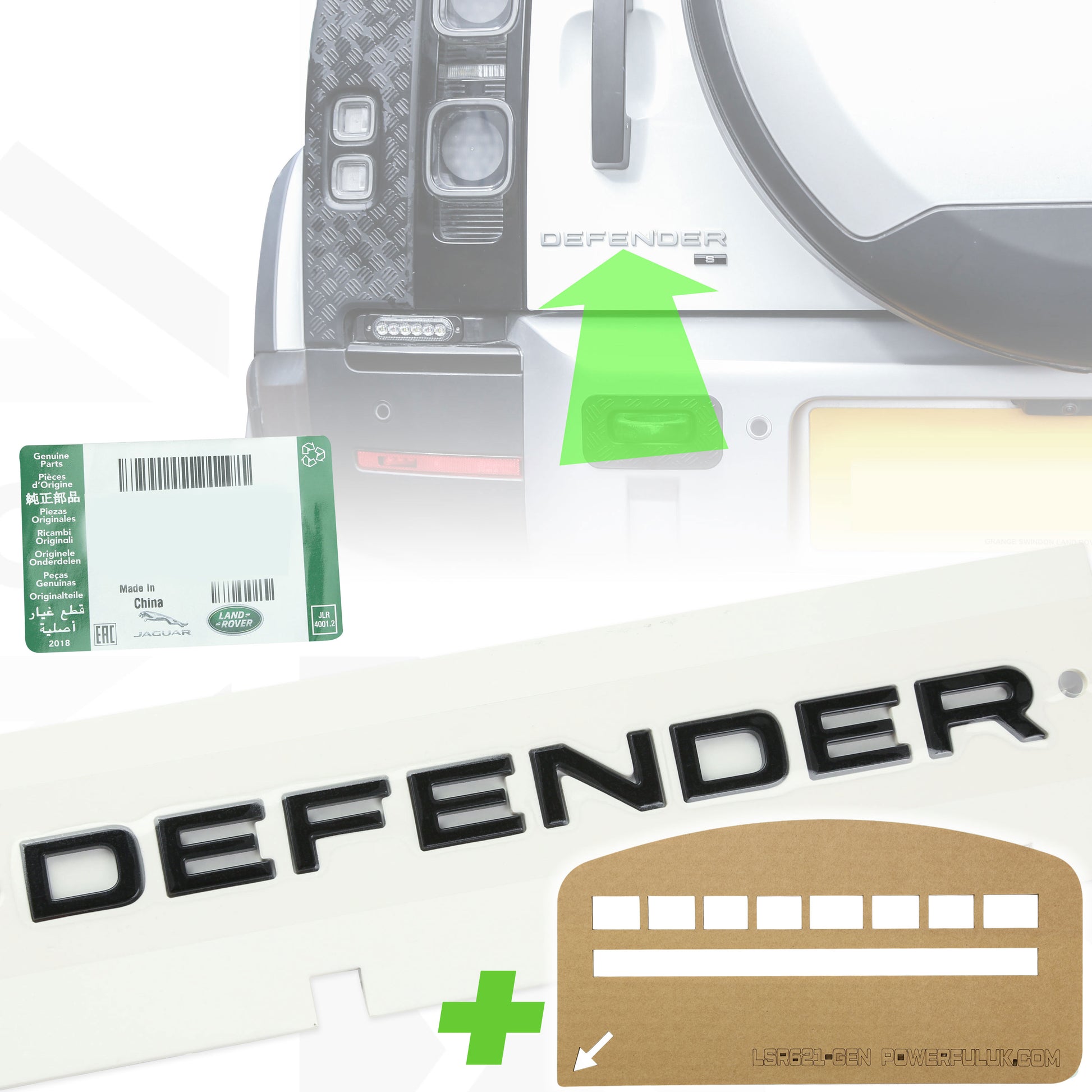 These DEFENDER letters come in a pre-spaced template from Land Rover but this does not help you with placement, it is also unusable to use if you want to retain your spec/engine badge underneath - so we also include our own template.