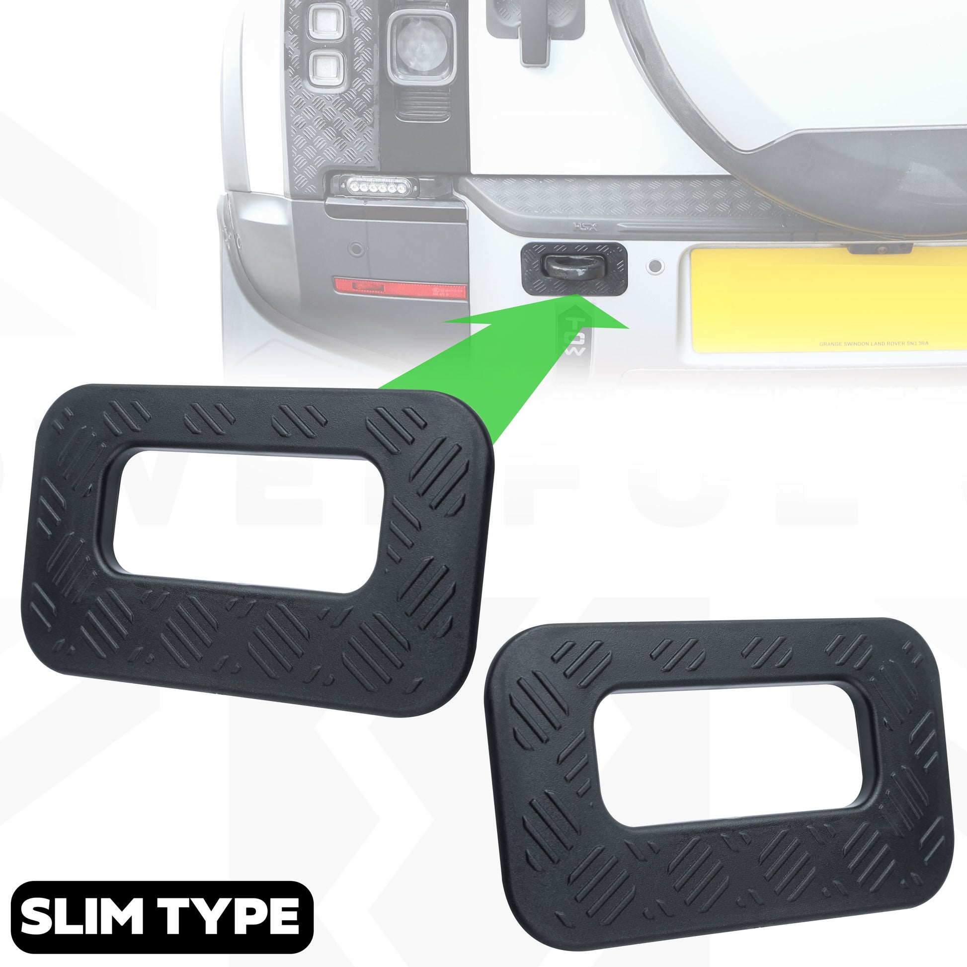 This listing is for a pair of chequer plate surrounds (slim type) for the rear tow loops on the Land Rover Defender L663.