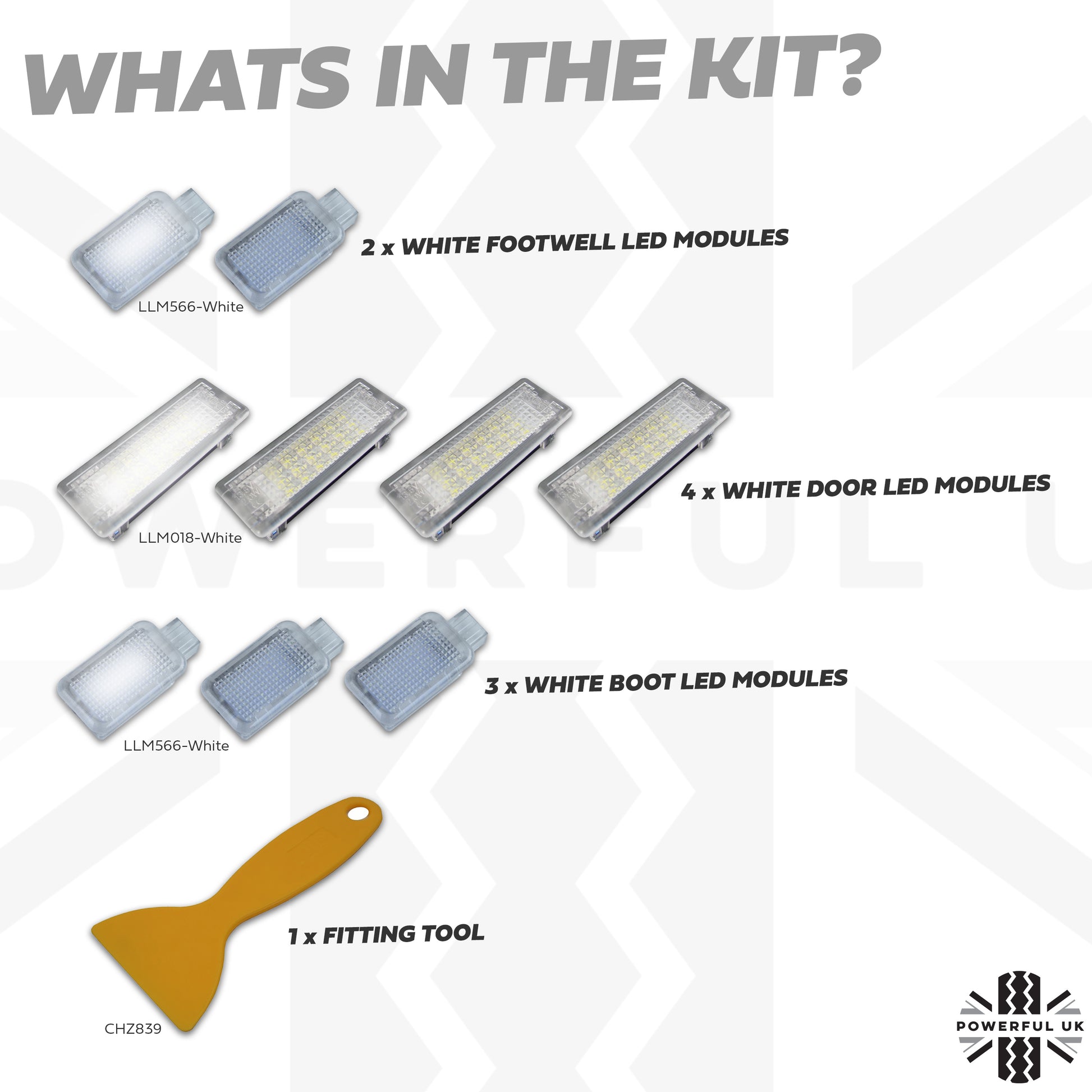 This kit will upgrade the standard lights in your doors, front footwells and boot.
