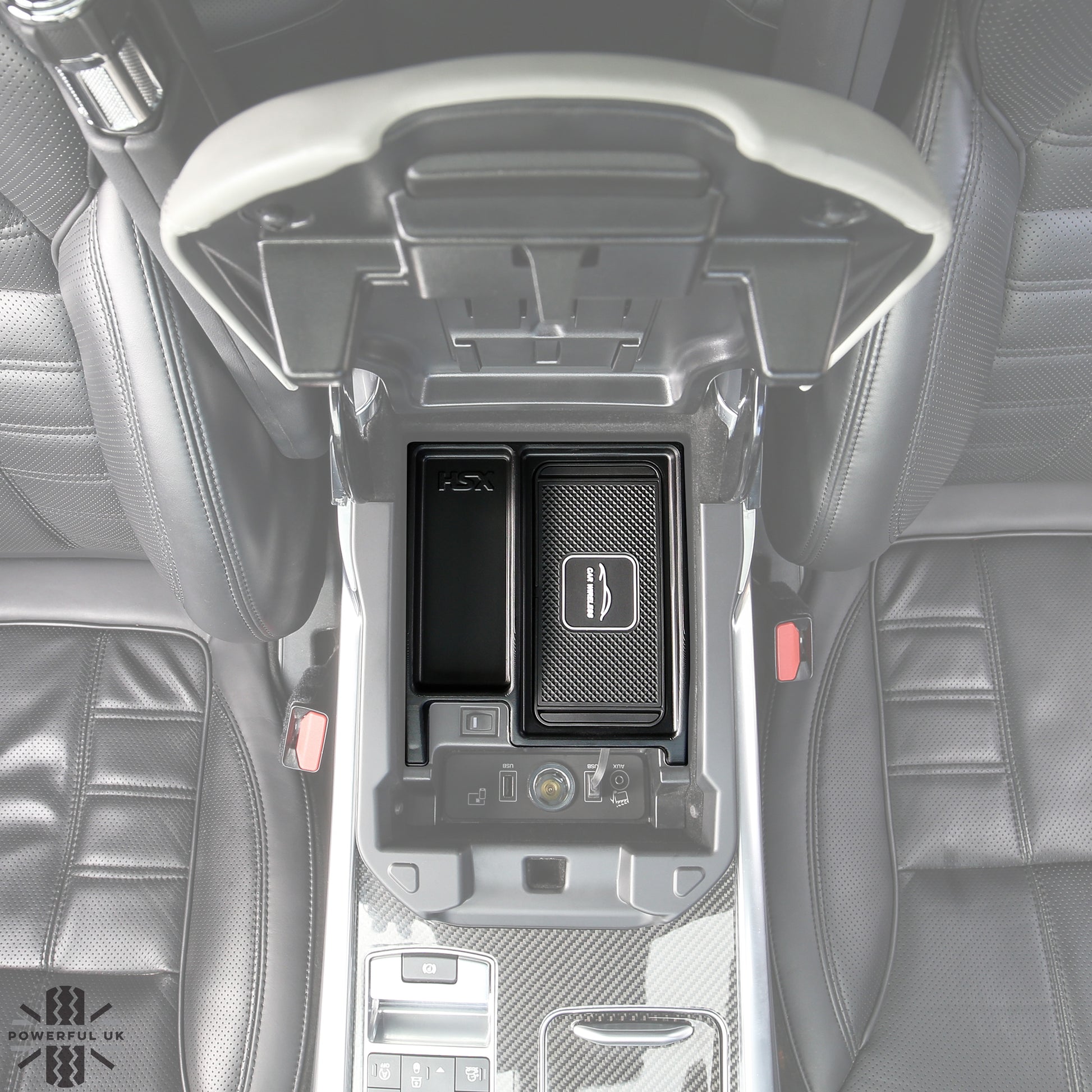 This tray fits neatly under the centre armrest and gives you wireless charging capability for Qi enabled devices (phones, earphones etc).